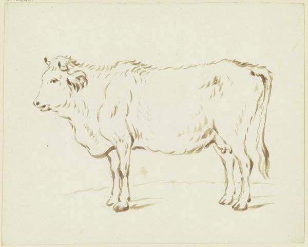 Friedrich Wilhelm Hirt made this drawing of a cow using pen and brown ink on paper. The choice of simple materials, like paper and ink, serves to highlight the cow's presence, its weight and form. Hirt's economical use of line, shadow and wash showcases his mastery of the medium, but it also speaks to a certain economy of labor. The image captures a moment in the production process. The cow, rendered with swift yet deliberate strokes, becomes a symbol of the rural economy and labor that sustains it. In this light, the drawing transcends mere representation, offering insight into the social and material conditions of its making. By appreciating the skill of the artist, the quality of materials, and the social context in which it was made, we gain a far richer understanding of the artwork.
