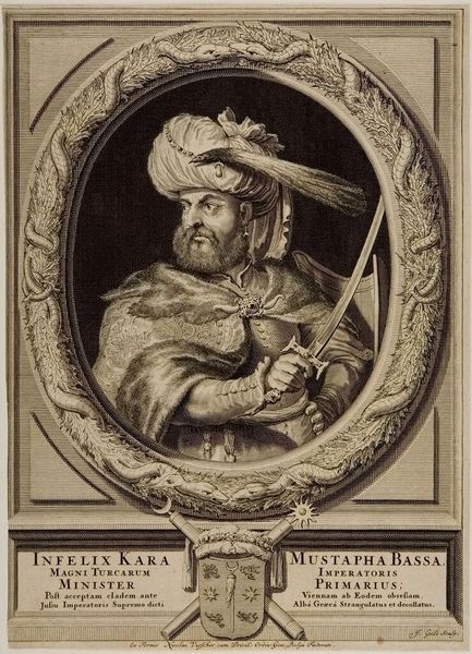 Curator: Today, we're looking at "Portret van Kara Mustafa Pasha," an engraving made by Jacob Gole sometime between 1670 and 1724. The print is currently held here at the Rijksmuseum. What’s your first impression? Editor: Ominous. Definitely gives off a “Don't mess with me” vibe. The guy is holding a sword and wearing what looks like an enormous bird on his head. Intimidating, dramatic, a bit baroque in its intensity, like a visual thunderclap. Curator: Absolutely. Gole's mastery of line and contrast shapes the reading. Note the careful balance between detail and abstraction, guiding the eye to key details—the subject's stern gaze, the ornate details on his turban and robe, all framed by that swirling, serpentine border. Editor: That border! I’m getting anxiety just looking at it! The frame, the text—it's all crammed together. There is a ton of symbolic information in the lower quarter. Almost like a heraldic shield gone wild. He wasn’t a subtle fellow, was he? Curator: Not particularly. The engraving highlights his power through visual rhetoric, presenting Kara Mustafa Pasha as a figure of authority and, given his historical role, perhaps also of ill omen. His failures in Vienna led to his execution—reflected, perhaps, in the stark blacks and whites. Editor: It’s the way Gole captured the textures that's impressive. The softness of the fur trim against the glint of the metal—it almost tricks you into thinking you're looking at layers, even though it's all line work. It's that contrast, isn't it, between the opulent textures and his harsh fate? The impermanence of power beautifully rendered. Curator: Indeed. It’s a fascinating piece, emblematic of the era’s fascination with portraiture and the use of printmaking to disseminate powerful imagery. It's also a clear demonstration of the artist’s formal skills, skillfully controlling visual tone. Editor: You know, staring at it longer, I think there’s a sad grandeur to it, too. Despite the evident status and menace, one can sense a kind of weight in his expression –the burden of leadership or perhaps a premonition? Something almost tragic. Curator: An astute observation. It's in those complexities that the true power of this engraving lies. Thanks for pointing that out.