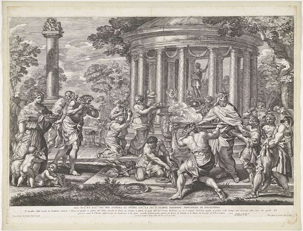 Editor: This is Antonio Gherardi’s "The Scourging of Saint Martina," a print likely created between 1654 and 1702. It depicts a rather violent scene, full of frantic energy. What strikes me is the contrast between the apparent chaos of the foreground and the more composed, almost theatrical background. How do you interpret this work? Curator: The violence is undeniable, isn't it? But let’s consider the social and historical context. This print, though baroque in style, engages with themes central to the Italian Renaissance: power, religious persecution, and female agency, or, rather, its suppression. Think about how narratives of female martyrdom were often deployed to reinforce patriarchal structures. Does the image itself reinforce those structures, or subvert them in some way? Editor: That’s interesting. I hadn't thought of it in terms of female agency. The Saint, although being tortured, appears almost serene. Curator: Precisely. Gherardi isn’t just depicting a historical event; he's actively shaping a narrative. What does the staging of the scene suggest about the relationship between spectacle and suffering, public violence and religious ideology? Notice the gazes of the figures in the background. Are they complicit, indifferent, or even titillated? Editor: I see your point. They seem like spectators at a play. The entire composition appears highly constructed to convey the saint’s passive stance as if endorsing a propagandistic tool. I wonder, if Gherardi attempted to critique violence in this way. Curator: That is very perceptive. He uses the visual language of power to critique power, doesn't he? By understanding this, we can discuss the legacy of the print as it challenges those intersectional structures through subtle cues of dramatic spectacle. Editor: This gives me a lot to think about. The artwork feels both disturbing and thought-provoking now. Curator: Indeed, engaging with such a piece challenges us to question how images shape our understanding of power, gender, and history itself.