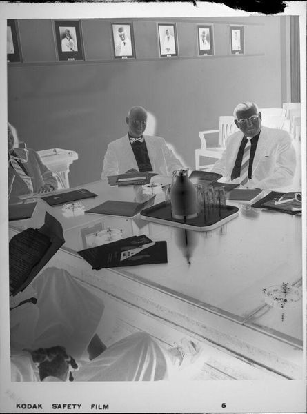 Editor: This is an intriguing photographic print by Peter James Studio, called "Untitled (man looking through files)." The stark contrast between light and shadow really catches my eye. What is your interpretation of this work? Curator: Note how the artist manipulates light to create depth and structure within the image. The subject's form is delineated by gradients, and the geometric composition, punctuated by the blinds and filing cabinets, emphasizes the planar construction of the photograph. Editor: So, the contrast serves to highlight the formal qualities of the scene rather than any narrative element? Curator: Precisely. The absence of a clear narrative allows us to focus on the photographic medium itself – the tones, textures, and the stark interplay of light and dark. Editor: I now see it as a study of light and form, not just a man at work. Thank you! Curator: A keen observation. It is these elements that elevate it beyond mere documentation.