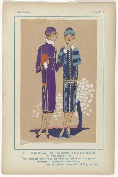 Curator: Let’s take a look at "Très Parisien, 1927, No. 3, Pl. 13: Créations PHILIPPE et GASTON - SUR LE PRÉ," a print by G-P. Joumard from 1927. It resides here at the Rijksmuseum. Editor: My first impression is "muted elegance." It's delicate, almost watercolor-like in its softness, and that restrained palette is so typical of Art Deco. But those dresses – talk about flapper chic! Curator: Indeed. The image functions as an illustration of high society at the height of the Jazz Age in Paris. We can examine it as a keyhole view of the social aesthetics during the Roaring Twenties, displaying wealth, style, and a newly defined feminine identity emerging after the First World War. Editor: Precisely. The way Joumard employs the technique suggests an assembly-line approach – flat planes of color, simplified forms – pointing to its potential for mass production and widespread dissemination, possibly within fashion magazines? How fascinating to consider this in relation to craft and material culture. Are these unique couture pieces or an early form of ready-to-wear replicated for the masses? Curator: It certainly raises important questions about accessibility and democratization. Though presenting couture, these images broadcast the aspirational lifestyle associated with Parisian fashion, a crucial part of France’s post-war image building and cultural influence. The decorative style flattens depth which promotes immediate access and aligns well with printed media consumption of the period. Editor: I agree. You see it not only as a matter of design and aspiration but also its role within globalized market capitalism! Thinking about who was producing the clothing and the paper… where were the textiles sourced? I am captivated by the global exchange that the work subtly suggests. Curator: It's an insightful layer. And it pushes us to reflect further. It invites reflection on the shifting values within art history—from solely focusing on elite fine art to considering print media as significant conveyors of cultural trends and societal aspirations. Editor: Definitely! It gives new meaning to how we regard fashion illustration not merely as commerce or marketing but rather a record of global connections expressed via material culture, manufacturing practices, social mobility, and lived experiences. Curator: It’s a print that captures more than just clothing. It's about projecting the values of an era. Editor: And a powerful reminder to always look deeper, past the image and consider its materiality and place in the grand economic chain!