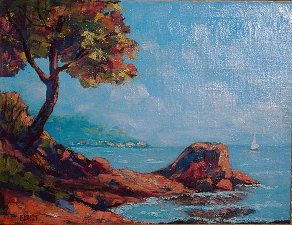 Editor: Here we have "Biarritz Beach" by Kimon Loghi, painted with oil on canvas in a style that definitely gives off an impressionist vibe. The most prominent aspect is the large, blossoming tree dominating the view, but with a tiny boat near the horizon that appears minuscule in comparison to everything. What do you see in this piece? Curator: The tree, laden with pink blossoms, speaks volumes. Pink is universally understood to symbolize romance and spring, rebirth and renewal. This is no ordinary tree. Its gnarled trunk twists skyward, bearing the ephemeral beauty of the blossoms. Don’t you think that this combination conveys the cycle of life? The fragility of beauty, even, given the transience of flowers. Editor: That's interesting; I was more focused on the colors. All of the light pastel blues, pinks and greens make it appear rather idyllic and calm, though, now that you mentioned it, a little melancholic. Curator: Exactly. It reminds me of traditional *hanami*, the Japanese custom of viewing cherry blossoms, that links spiritual reflection with the fleeting moment. Now, consider the solitary sailboat on the water – what does that suggest? Editor: Perhaps a journey or a search? It looks small compared to the rest of the composition and, thus, slightly isolated. Maybe a symbol for our individual journeys, existing amidst this larger, more constant cycle? Curator: Precisely! Loghi masterfully uses these visual symbols – the blooming tree, the open water, the small boat – to invoke deep cultural memories and understandings of life, change, and our place in the world. I like to believe the painting depicts optimism about moving on despite the potential dangers, even the fragility of sailing alone in a sea. Editor: I didn’t even realize the full extent of symbolism present; there is so much going on, far beyond depicting just what is pretty or beautiful! It seems almost biographical! Curator: Indeed. Art has the potential to be very personal when related to the world's greater issues.