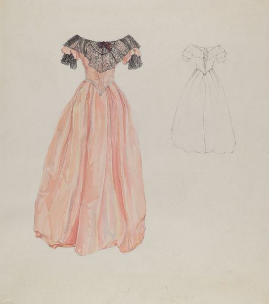 Lillian Causey made this watercolour painting of a wedding dress at an unknown date. Isn’t it funny how a dress design can be a work of art in its own right? The whole thing shimmers, light reflected off satin, captured in delicate washes of grey. Look closely, and you can see how she builds up the form with these transparent layers, hinting at shadows and folds. The drawing on the left shows more definition, the waist tightly cinched with a lovely bow. Whereas the one on the right feels more ethereal, almost fading into the background. The addition of the semi-transparent cape gives it a ghostly quality, like a memory of a dress rather than the thing itself. I’m reminded of those fashion sketches you see by designers like Erte, but here there’s a kind of homespun quality. More like an act of loving documentation. And that makes it special, wouldn’t you agree?