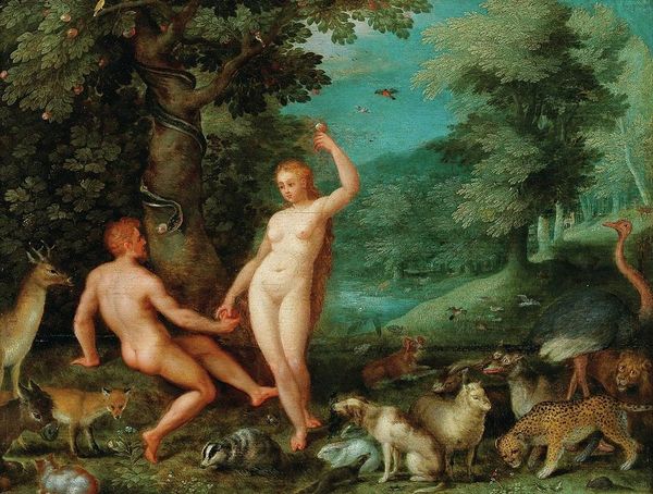 Curator: Oh, isn't this just deliciously unsettling? Correggio's "Leda and the Swan" from 1532, now residing in the Gemäldegalerie in Berlin, truly invites you into its ambiguous little world. I find the swan's caress more menacing than tender. What's your first impression? Editor: Well, "deliciously unsettling" pretty much nails it. Beyond the obvious dynamics on display, I am first struck by the luxuriousness of the scene's construction. Consider the layers of oil, likely refined by then-sophisticated pressing methods, combined with the possible use of a walnut wood support allowing for these smoothly modeled figures... Curator: See? The material world creeping into our mythology! I love it. The layers, not just of the paint but of the story, they deepen the resonance. It's a painting, yes, but also a meticulously constructed fabrication, a divine encounter reshaped by human hands... and appetites. It whispers of textures and desires. What do you see of the hand of labour here? Editor: Absolutely! And think about where Correggio was situated; amidst the political wrangling between the Papal States and other burgeoning powers! The ultramarine blues alone signal a financial investment—perhaps funded via mercantile activity in Venice. The labour is, yes, within Correggio’s craft and the training that afforded him that craft, but also the vast networks that supported him with precious pigments. Did such luxurious creation require cruel realities? Curator: Ooh, you've pierced a bubble. It pops my head right out of Olympus! Cruel realities indeed. Looking again, Leda's almost defiant gaze seems to know those shadows, not just in the literal wooded backdrop. Even the languid pose, perhaps it isn't submission but rather a grim awareness? What looks soft feels… complicit, knowing it needs resources that were procured violently elsewhere? I get that, I think. Editor: Indeed. Even the 'effortless' brushwork bespeaks hours, years, perhaps generations of learned skill honed, possibly, under the burden of a brutal economic engine elsewhere. Leda, though depicted passively, is a fulcrum for these material histories! Curator: Which adds another layer, doesn't it? The mythology and the history collapse together here, into a knowing reflection of human nature itself. Is anything truly "natural", let alone divine, once humans handle it? This one has legs, metaphorically, and implications that reach far beyond that swan’s wing! Editor: Quite right! "Leda and the Swan," considered in its own moment and in ours, prompts crucial questions about material desire. The artist's rendering—so sensual and knowing— invites continuous looking, and reckoning.