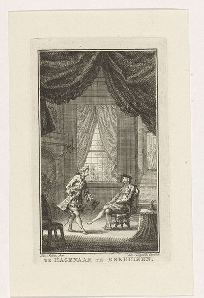 Curator: Let's turn our attention to "Geleerde in studeervertrek," or "Scholar in a Study," an engraving made in 1759 by Simon Fokke, currently held in the Rijksmuseum collection. Editor: Whoa, the detail! It's like stepping back into a philosopher’s chaotic sanctuary. Overflowing with a certain contemplative atmosphere. Curator: Indeed. Engravings like this offered a relatively affordable way to circulate images and ideas during the Enlightenment. Fokke was quite a prolific printmaker, known for portraiture, history painting, and these genre scenes. Consider the rise of a literate public and how prints contributed to debates in the Republic of Letters. Editor: He looks kind of comfy, actually. Amidst the visual overload of books and globes, this "scholar" seems utterly at ease. Is he supposed to be a specific person? Because I am getting strong "Gandalf taking a break" vibes. Curator: We do not know if the artist intended a specific likeness, although prints were commonly published as portraits. These were also important markers of status. The bust, architectural detailing, draped curtains—they signaled cultivated taste, knowledge, wealth. Notice how Fokke contrasts light and shadow to draw our eyes to the figure's face and the musical score. Editor: That robe looks pretty luxurious too. The music's a nice touch. Maybe it speaks to the era's focus on bringing harmony, or a specific system, to… everything. It’s so neatly balanced with all the overstuffing surrounding the figure in the print. I am actually enjoying all this detail. Curator: The text on the print also forms an integral part of its design. What do you notice? Editor: My Dutch is terrible, I am embarrassed to say! I assume this concerns authorship, something to do with inscriptions in a book… Maybe it indicates where it can be bought. Anyway, you are right to ask. So often we forget these used to include such explanatory statements! Curator: Precisely. These details were included because they conveyed information but also demonstrated cultural understanding and a refined background to would-be buyers. A fine dance of display! Editor: Thinking about that balance—this print offers us, in its own way, a glimpse into how images played a central role in solidifying one’s image. Even back then. Curator: Absolutely, and how potent imagery became in an ever-expanding world. Editor: Well, I know which aesthetic I'm striving for now: “comfortably erudite.” Thanks, Simon!