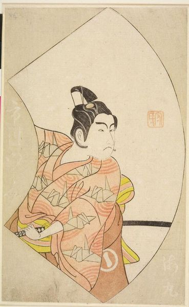 Curator: Standing before us is a painting called "Parody of Murasaki, from "Lavender" (Wakamurasaki), chapter 5 of the Tale of Genji" created sometime between 1700 and 1741 by Kawamata Tsuneyuki. It's currently residing here at the Metropolitan Museum of Art. Editor: Oh, it feels so delicate, so fleeting. Like a spring breeze captured on silk. The colors are muted, almost melancholic, yet there's a quiet beauty. Curator: Precisely. Kawamata Tsuneyuki captures a scene evoking both a landscape and a portrait—very typical of Ukiyo-e genre painting traditions that favored such delicate rendering and symbolic depth. The Tale of Genji itself is full of nuanced observations on the ephemeral quality of beauty and romance. Editor: That staircase... It leads the eye, but where? Is she ascending or descending? And the lone bird above… it all whispers of transition, a poignant farewell perhaps? Also the grid pattern in her robes, combined with the floral design creates this curious tension of rigor and liberty, or control and abandon. Curator: Fascinating reading. One could suggest it’s both—a kind of in-between state where choices haven't fully hardened, still carrying all their delicate promise, a tension amplified through the contrasting themes evident across its many landscapes. That single bird can signal hope or the departing of a season, it truly leaves interpretation open, while those blossoms could imply the fullness of youth, and its quick passing, or its quick fading Editor: Yes, like holding a handful of cherry blossoms knowing they will wither. Even her birdcage sitting on a side table, it seems that all of these subjects of interest are longing for open space. Curator: I quite agree. Tsuneyuki certainly packs potent layers into a seemingly simple watercolor. Editor: Makes me reflect on beauty and inevitable change. Something lovely about facing it head-on. Curator: Indeed. And with that in mind, let's carry that perspective forward and discover some of these deeper connections that these earlier moments of realization, of reflection help us feel through beauty's capacity, and by contrast what feels inevitably altered by it through passage.
