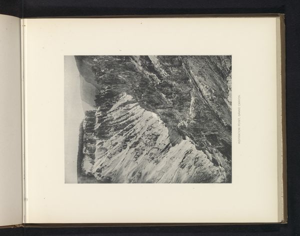 Editor: Here we have a gelatin silver print from 1936, "View of the Grand Canyon, United States, from an Airplane," by Wouter Cool. The way the light plays across the canyon walls is really striking. What jumps out at you when you look at this photograph? Curator: Initially, the interplay of light and shadow dictates my gaze; Cool seems less interested in geographical vastness and more in the structural composition made by the variations of light. Do you see how the formal elements—the contrasting textures of rock and foliage—create a dynamic visual experience? Editor: I do, and the aerial perspective is also key. It flattens the landscape, almost abstracting it. How does that flattening affect our interpretation? Curator: Precisely. It compels us to focus on the surface, the arrangements of tonal values rather than depth. The receding planes, despite suggesting distance, become formal devices, establishing a pictorial rhythm. It makes you think about line, shape, and form as organizing principles. The details matter more. How might our interpretation change if this were taken from the ground? Editor: I imagine we’d lose that sense of pattern. We'd see a grand vista but perhaps miss these smaller visual rhymes and contrasting forms. Curator: An earthbound view invites narrative and perhaps the sublime; the aerial perspective reframes our encounter, directing us toward structure and pattern. Editor: So, by choosing this high vantage point, Cool prioritizes the aesthetic organization over a purely representational function. It's less about "being there" and more about appreciating the design. Curator: Exactly. The artistry exists not in the subject, but in the careful articulation of visual form, emphasizing structure, organization, and the photographic medium itself. I've certainly found a new way to look at landscape photography. Editor: This has definitely shifted how I'll approach similar images. Thanks!