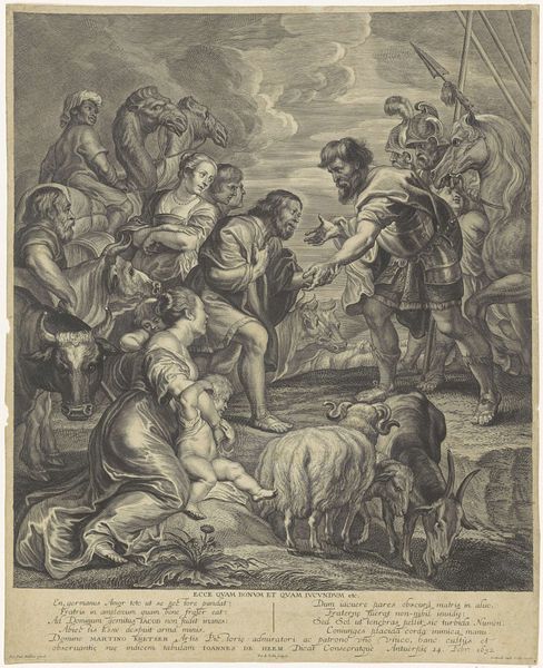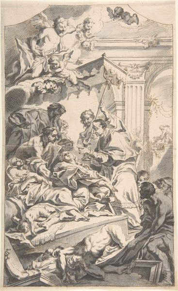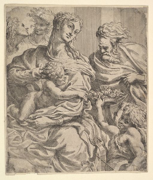 Editor: So, here we have Orazio de Santis’ "Geboorte van Christus" from 1572. It's an etching, so it's all in black and white, and immediately I notice how dynamic it feels, even without color. So many figures crammed into the composition. How do you read the density of the marks and forms here? Curator: Precisely. The composition, first and foremost, establishes a structured dynamism. Note how Santis employs the hatching technique; see how the varying densities modulate the tones and direct our eye. Observe the linearity – how it both defines form and creates movement across the picture plane. What effect do you believe these create? Editor: It does give the impression of many layers, like you're peeling back ideas through the different lines that you discover across the etching. They sort of add up to the whole, don't they? Is this just characteristic of the time? Curator: Certainly, the period – the late Italian Renaissance – emphasized linearity. However, observe how Santis doesn't merely replicate established norms. Instead, his application of cross-hatching transcends simple modelling. The overlapping lines become an active element, almost an independent structure within the depicted scene. Editor: So, it’s not just about creating the illusion, but also the medium becoming part of the message itself? Curator: Correct. Consider the interplay of light and shadow. Santis masterfully crafts a range of tones solely through the density and directionality of his etched lines. The highlights almost seem to emerge from the darker recesses, not just descriptively, but expressively. It's the materiality, not just the image, that delivers a specific tone. Editor: I hadn’t quite considered that! It makes me think differently about the levels of planning that go into what seems like a very linear, almost two-dimensional format. Curator: Indeed. It is this careful attention to the material components of art-making that helps unveil layers of meaning behind the image.