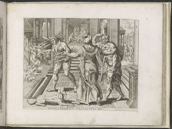 Curator: I see panic and awkwardness distilled into ink on paper. It’s strangely compelling. Editor: We're looking at "Ulykkelige hændelser nr. 6" or "Unhappy Events No. 6," an etching, engraving, and drawing by Georg Christian Schule, created around 1787. The artwork resides at the SMK, the National Gallery of Denmark. I find Schule's satirical rendering here very evocative. What's catching your eye? Curator: The theatrical quality is strong. It's like a snapshot from a badly directed play, the figures caught mid-escape, one on a ridiculously small horse, the other nearly colliding with that classical doorway. I immediately interpret this piece through a queer lens. It whispers of repressed desire and anxieties around masculine performance, no? Editor: Absolutely, considering the societal structures in late 18th-century Europe. Schule’s use of caricature here seems very pointed. This wasn't just idle jesting, but a visual commentary. Consider how power dynamics were reflected and reinforced. Curator: The setting is curious—part idyllic countryside, part imposing architecture. It's a world where social expectations literally box you in. And the fleeing figure seems eager to uphold that status quo, doesn't he? Even at the expense of looking utterly absurd. It is hard to deny its queer undercurrents: this piece becomes especially intriguing if one reads it through a lens informed by critical race theory, thinking of visibility as a social construct. Editor: Or perhaps Schule seeks to depict not merely physical escape, but escape from a system designed for repression. The use of line work, particularly the frenzied etching in the background, only intensifies that emotional landscape. It becomes clear the piece may seek to use Romantic artistic tools and strategies, yet mockingly. The artist walks a thin line between two worlds. Curator: Thinking about it now, its lack of clean lines might have been to make the figures not easily defined as to reinforce their othered identities. I find myself pondering the potential interpretations even more deeply. Editor: Exactly. Schule is making us work, isn't he? And in that labor of interpretation, maybe we catch a glimpse of our own biases, too. Curator: A glimpse indeed. It appears this little etching has plenty to teach us about ourselves. Editor: Well said!