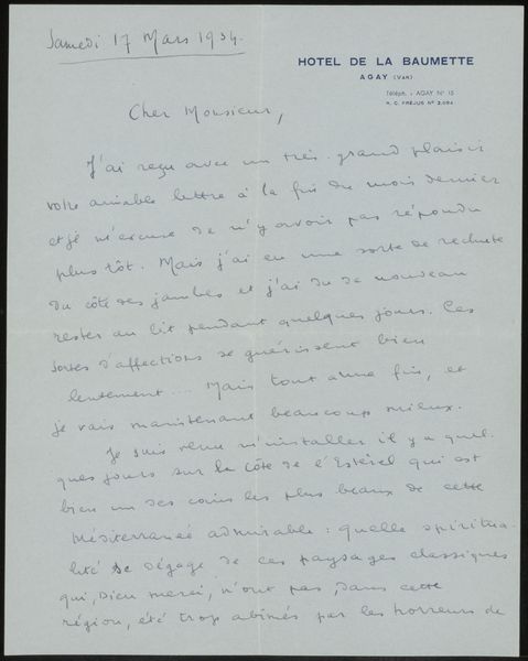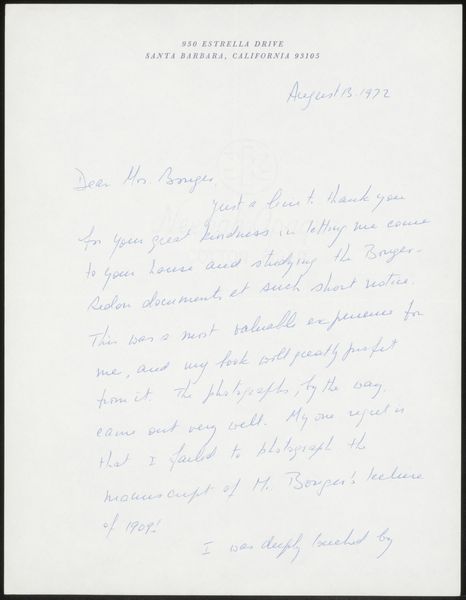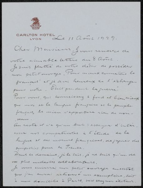 Curator: So, this delicate object before us is entitled "Brief aan Françoise W.M. Bonger," or "Letter to Françoise W.M. Bonger." It’s a pen and ink drawing on paper, thought to have been created around 1939 by Pierre-Georges Martin. Editor: The texture! Look at how the ink bleeds slightly into the page. There's something so intimate about seeing the handwritten words and the tiny imperfections that reveal the writer's hand and intentions. You feel like you're reading over someone's shoulder, right there with them. Curator: Absolutely. The letterhead indicates it was written from 89 Whitelands House in Chelsea. Françoise Bonger, the recipient, was, of course, the widow of Theo van Gogh, and instrumental in promoting Vincent’s work. The letter itself appears to express regret over a postponed trip. Editor: It's poignant. Nineteen thirty-nine… the air thick with tension as war looms. The mundane becomes precious, the simple act of correspondence freighted with a desire for connection before… well, who knows what lay ahead? He’s wanting to visit her, expressing disappointment that he cannot come because of other events that made her to left Amsterdam Curator: Yes, one can’t help but feel the weight of that historical context. A seemingly simple note becomes imbued with a deeper sense of longing and perhaps even foreboding. The delay is a metaphor. This message would never cross the channel so she could know of his regard for her and sadness they would not be seeing each other soon, if ever. Editor: Exactly! Art helps make sense of things! Think about how many people read those letters she saved that might never have read a comic, seen some art, much less care what someone in a far-off land, even nearby Holland, thought, but here they all were, caring that the mail would go through at least once! Now you are an artist, and what do you plan to have saved to be able to teach about life as an artist through the things that people held and read and valued? So much time writing all of this in those times, like today on screens, things lost by hard drive damage. How to keep going when losing? Is what art has brought to humanity! Curator: Well, that is all very relevant. And perhaps seeing this piece reminds us of the fragile nature of communication and the enduring power of art to connect us across time. Editor: Precisely. Each mark here holds whispers, shadows of an individual perspective. As an artist, one appreciates so strongly the message, however the form has held that idea inside of it since the idea had the impulse to arrive here in material from the inmaterial world.