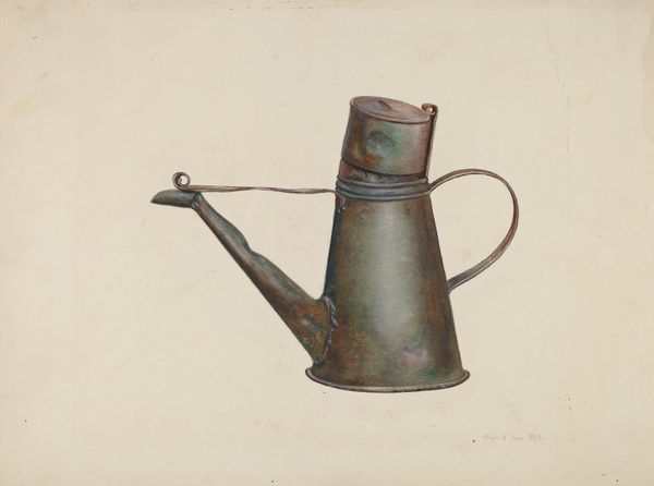 Editor: This is Walter Hochstrasser's "Lantern," circa 1938, a realistic drawing combining charcoal, ceramic and watercolor. It’s quite humble and utilitarian. What catches your eye, or how do you interpret this ordinary object? Curator: I see more than just an ordinary object. The lantern, historically, has always been a symbol of hope, guidance, and knowledge, particularly during times of darkness. How does Hochstrasser render the texture, and how might that reinforce the lantern’s symbolic weight? Editor: Well, the metallic texture is wonderfully captured with what appears to be masterful highlighting. It almost feels tangible, which strengthens the lantern's real-world presence and therefore its guiding role. Does that fit with the lantern as an icon, or am I stretching it too much? Curator: Not at all. The patina of age and use suggests a history, stories it could tell. Light, of course, chases away shadows—but notice the lantern itself *casts* a shadow, becoming a potent reminder of obscured or hidden truths. It encourages us to look beyond the surface and reflect on our own sources of light, both internal and external. Editor: That's really interesting. So the object isn’t just *of* light, but also *about* confronting what remains unseen. I had just thought of it as an old lantern. Now I see a whole layer of meaning I was completely missing. Curator: Symbols live through sustained observation and contemplation. Each of us, reflecting, brings new insight. What started as an ordinary object now illuminates our thinking. Editor: Definitely! Thanks to your perspective, it’s not just a drawing of a lantern anymore; it’s a symbol to reflect upon!