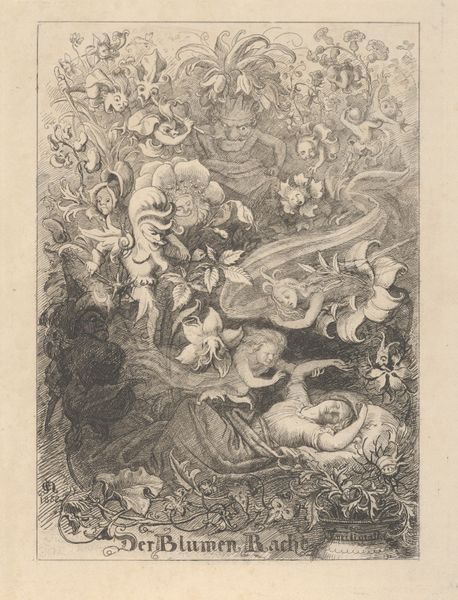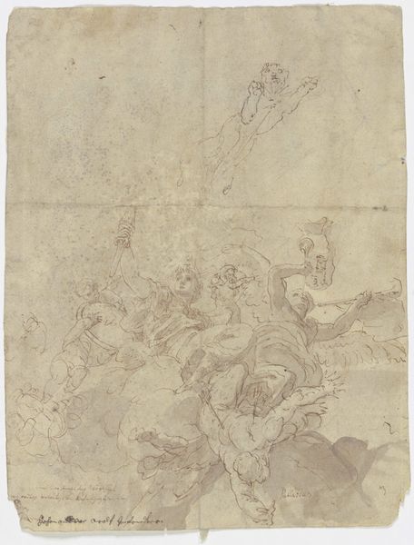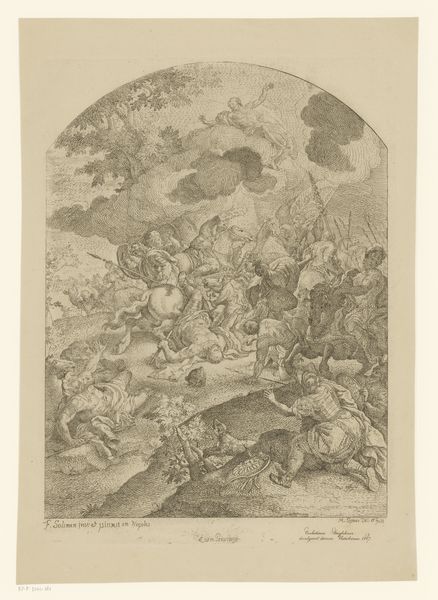 Curator: Looking at this print, I’m struck by the sheer drama and implied sound. All those straining bodies. Editor: That's a superb initial read. This is an engraving by Giovanni Pietro Possenti, dating from around 1635 to 1664. The piece, currently residing in the Metropolitan Museum of Art, is entitled "The Forge of Vulcan with Smiths striking an anvil with hammers, while Mars and Venus embrace in the heavens above." Curator: Embracing deities above a scene of sweaty labor... I see a fascinating juxtaposition here. This artist masterfully blends themes of love, war, and the everyday grind, reminding us that even gods aren't immune to human foibles, if not earthly effort. Editor: Agreed. Possenti’s graphic treatment, created by way of printmaking techniques, adds to this powerful emotional tension through dramatic, linear composition. The way light and dark converge amplifies its dynamic energy, pulling me in to the relentless hammering. The chaotic tangle of lines almost vibrates on the surface. Curator: Observe how this aligns with the Baroque sensibility: a real fascination with intense movement and emotion, expressed using recognizable allegorical characters. The inclusion of Vulcan's forge hints at ideas of creation, industry, and perhaps even destruction, all common threads woven through that period. It's amazing to observe that printmaking played an outsized role in shaping the symbolic imagination. Editor: Yes, you can see how the spiraling figures seem to draw from Mannerist painting, creating a sense of almost manic activity contained within the bounds of the page. The tonal gradations achieved with those lines are remarkably sophisticated, given the medium. Curator: I keep coming back to how the placement of Mars and Venus almost neutralizes the visceral labor portrayed below. This placement emphasizes a type of universal balancing act between conflict and affection. A cultural memory passed through repeated, similar visual tropes. Editor: It also reminds us of the social and historical importance of printing in the distribution of ideas, artistic styles, and moral codes during this era. The artist invites close reading and moral reflection via the composition itself. Curator: Seeing it through the lens of psychology and anthropology, it confirms how symbols carry weight. Each viewing reinforces shared knowledge. Editor: By analyzing formal aspects in conjunction with historical meaning, the work unveils both its intrinsic power and embedded ideologies. Fascinating.