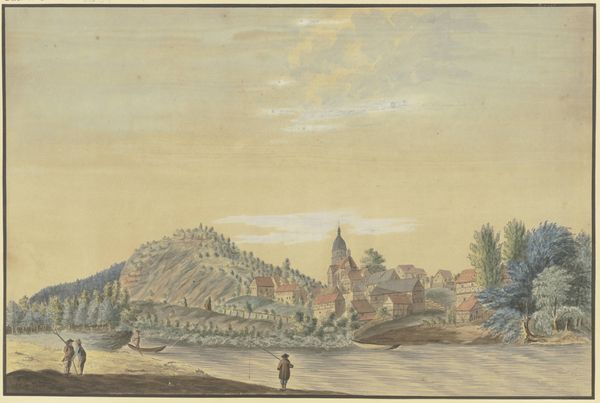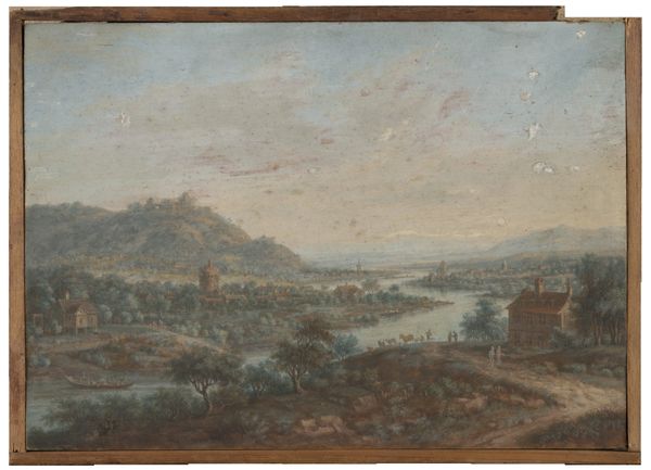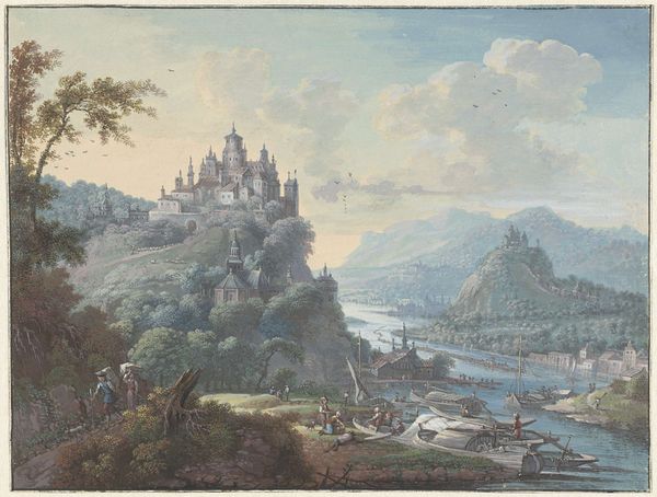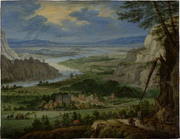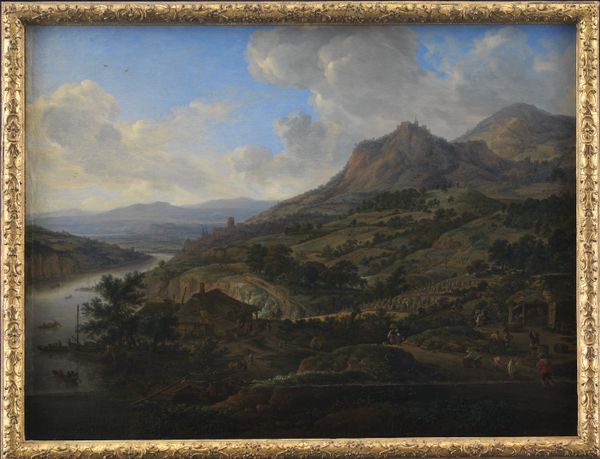 Curator: Good morning! We’re standing before Jan Griffier’s “River Scenery,” believed to have been painted sometime between 1660 and 1718. It's an oil on canvas. What are your immediate impressions? Editor: It's remarkably serene. The haze in the distance creates this beautiful, almost dreamlike quality, though it also makes it feel somehow... distant. I can almost smell the river air, even though there is a somewhat unreal atmosphere to it. Curator: The dreaminess likely comes from Griffier’s stylistic choices. He positions himself and, by extension, us, as observers overlooking this bustling river scene. We're witnessing a genre painting rendered with a somewhat baroque touch—the human figures are minute, almost props within the grand landscape. Do you agree? Editor: Yes, it's fascinating. He's elevated the everyday—the trading and boat traffic, that is—to this picturesque spectacle. I mean, look at those figures! They’re like little ants scurrying around at the edge of some titan’s picnic. How do you feel this kind of presentation informs how we perceive 17th century genre scenes, which by the way were frequently shown in public arenas to boost patronage in that era? Curator: That's a very insightful observation. By showcasing daily life, he simultaneously creates a sense of ownership and celebrates the burgeoning mercantile power that characterized the Dutch Golden Age. He presents an idealized and grand vision, a public narrative reinforcing social stability. The detail in portraying the mercantile hustle near the riverside underscores these ambitions. Editor: Precisely. So the romantic haze serves as both a compositional element and, essentially, soft propaganda. Are we meant to marvel at the beauty, or the industriousness? Or is it an odd brew of both? Perhaps its popularity back then sprang from such visual coddling... Curator: Exactly. It’s not about confronting reality; it’s about celebrating an already constructed and deeply optimistic view of it. Griffier captured a collective ambition. What a picture. Editor: Indeed. Next time I cross a bridge, I’ll ponder whether it's simply for crossing, or for staging the theater of dreams. Curator: An excellent thought. Let's proceed.