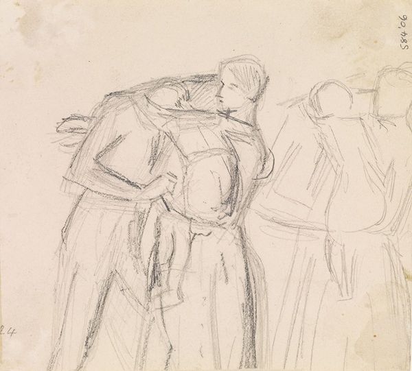 Curator: This pencil drawing, entitled "Kinderen in de schoolbank," or "Children at school desks," is attributed to Carel Adolph Lion Cachet, and thought to originate somewhere between 1874 and 1945. It is currently held at the Rijksmuseum. What are your initial impressions? Editor: The drawing's sketch-like quality, executed on toned paper, lends it a sense of intimacy and immediacy. The subject matter suggests a story, doesn't it? I feel the weight of the school system's expectations through their postures. Curator: Exactly. Looking closely, we can see Cachet's light pencil work creates a wonderful depth, given the spartan materials. Notice how he's captured the light reflecting on the children's heads, especially. We are dealing with simple pencil on paper, but it’s how he coaxes that tonal variation. Editor: I agree, the variation really gives life to the sketch. Considering the historical context, school for children was becoming more widely accessible, but simultaneously compulsory. Who did these new pedagogical practices include, and who did they exclude? Was the artist considering the labor being formed? Curator: That’s certainly one reading. I think too we can think of the education systems, particularly in the late 19th and early 20th century, as being a site of both labor and control. And we see this through other sketches too that explore industrial practices as well, connecting the children to these larger networks. Editor: That makes me consider it as a study of the dynamics between individuality and conformity, especially observing the small differences in how each child holds themselves, alongside the more blurred figures that resemble something closer to a crowd. It brings forth the many discussions within feminist pedagogy about who these institutions of learning are really meant to serve. Curator: A fascinating intersection! It’s intriguing how much information can be conveyed with such minimal means. The focus on the labor of education really pulls at a variety of perspectives. Editor: Agreed, it invites a continued questioning and deeper understanding, challenging our modern expectations and assumptions.
