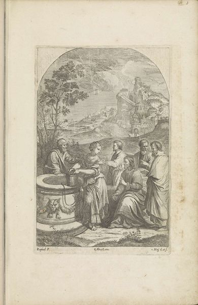 Curator: Oh, this print immediately gives me a shiver, doesn't it you? Something about the high contrast of the lines... the way that scene unfolds. Editor: Indeed. What we are looking at here is titled “Mozes wordt gevonden door de dochter van de farao," or “Moses Found by Pharaoh's Daughter,” an engraving crafted sometime between 1705 and 1728 by Joseph Mulder. Curator: Mulder… It's the story, though. Finding Moses… There’s an intensity, a silent scream within the delicate lines. I imagine Mulder tracing and etching with fierce precision. Look at how they're composed, this almost choreographed reaction to seeing the babe, as if his fate ripples outward. Editor: And what about the material conditions that enable the distribution and viewing of a reproduction like this one? I see an incredibly detailed, baroque composition; so much labor and skill distilled to its printed form for wider distribution to new audiences beyond a unique painting. Consider also how printmaking facilitates a shift in consumption patterns: now, sacred imagery can reach a new, expanding bourgeois public who collect prints and use them as decor for their homes. Curator: Right! Like little seeds of stories spreading on paper! I hadn’t thought about how the engraving actually gives the story new legs... Makes me think about how myths travel—transforming each time they’re retold. Moses in a paper boat instead of a bulrush basket – almost. What’s also fascinating is how, for many viewers in 18th century Holland, the story of Moses became domesticated by finding it on the wall next to the fireplace or at the bedside! Editor: Precisely. By converting this pivotal historical narrative into a widely disseminated domestic object, Mulder democratized it by making accessible to many who otherwise might not have encountered such a profound biblical scene. Curator: It’s wild how craft mediates experience… Thank you Mulder, you are my Moses today. Editor: Ultimately, the history of art is contingent on such technologies. In the case of this particular composition, Mulder transformed and disseminated, through exacting methods, art and knowledge for new historical audiences.