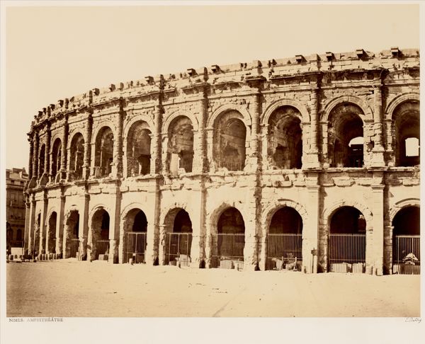 Curator: Francis Frith's photograph presents the interior of the Colosseum. The exact date is not known, but Frith lived from 1822 to 1898. Editor: The sheer scale is striking. It feels both imposing and desolate, doesn't it? The light emphasizes the ruinous state. Curator: Indeed. Observe how Frith has framed the architectural details, drawing our eye to the repetitive arches and the play of light and shadow. It’s about form. Editor: But can we divorce it from its history? The Colosseum was a site of violence and imperial power. That lone figure in the center only amplifies the sense of human insignificance against such a backdrop. Curator: The composition also uses that lone figure to highlight the immensity of the structure; see how it emphasizes the geometric precision that Frith meticulously captures. Editor: Precisely. The photograph serves as a stark reminder of systemic oppression and the spectacle of violence as entertainment. Curator: I find that the photograph transcends the literal; it becomes a study in light, line, and the enduring power of architectural form. Editor: And I find it impossible to ignore its loaded past; it's a site of trauma made aesthetic.