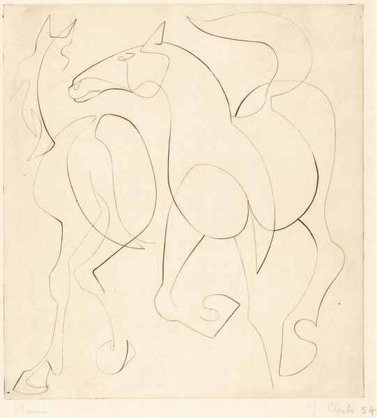 Leo Gestel made this drawing of rearing horses in a meadow of flowers with pencil on paper. I love the immediacy of a sketch like this; it’s all about the artist's hand moving across the page. You can see the energy in those quick, confident lines that define the horses' forms, and the playful way he suggests the flowers below. It's like you’re witnessing the thought process right there on the page. The texture of the paper peeks through the graphite, giving the whole thing a kind of breathy lightness. Look at the horse in the foreground, how the lines seem to dance around its body. Those marks don’t just describe a shape, they give it life, a sense of movement and tension. You can almost hear the horses snorting and pawing the ground. It reminds me a little of Franz Marc's drawings. But while Marc was interested in expressing the animal's inner spirit, Gestel seems more interested in the sheer joy of drawing, of capturing the essence of a moment. Art, at its best, embraces these kinds of ambiguities.