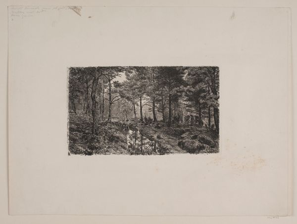 Louis Adolphe Jacobs created this etching of a path in a densely overgrown forest. As an etching, its origins are in labor, and the effects of acid on metal. The image begins as a metal plate, likely copper or zinc, coated with a waxy, acid-resistant ground. The artist then draws through this ground with a sharp needle, exposing the metal. The plate is immersed in acid, which bites into the exposed lines, creating grooves. The longer it’s bathed, the deeper the lines become, allowing for darker, more pronounced marks. The plate is then inked, and wiped clean, with ink remaining only in the etched lines. Finally, it’s pressed onto paper, transferring the image. The process allows for delicate lines and textures, seen here in the dense foliage and subtle gradations of light. Every line is a result of labor and chemical action. The rich blacks and grays, the depth of the etched lines, and the texture of the paper all contribute to the atmosphere of the forest. By understanding the processes by which art is made, we recognize the hand of the artist, and these processes collapse the distinction between art and craft.