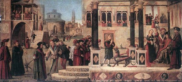 Editor: Here we have Piero della Francesca's fresco, "Finding and Recognition of the True Cross," created around 1466. The colors are so muted, and yet there's a real sense of depth created by the perspective. It’s beautiful, but also kind of puzzling in its layout. What strikes you most about this work? Curator: For me, the significance lies in how Francesca transforms fresco, a traditional craft material, into a medium capable of conveying complex narratives. Notice the deliberate flatness in certain areas contrasting with his famed perspective. Editor: Flatness? I was so drawn to the illusion of depth. Curator: Precisely. Consider the act of creation. Fresco demands working directly onto the wall, a public and permanent declaration. This isn't just about illustrating a religious story; it's about Francesca showcasing his mastery of material production and controlling this space. The labor inherent in this process—the preparation of the plaster, the precise application of pigment—it all becomes part of the artwork’s meaning. Editor: So, you're suggesting that the way it was made, the physical process itself, tells part of the story? Curator: Absolutely. The social context is equally important. Commissioned for a church, the fresco had a clear function: to communicate religious ideas to a broad audience. Yet, by emphasizing perspective and creating realistic figures, Francesca elevates the craft of fresco into “high art,” blurring these conventional categories of art. The raw materials are humble but look how Francesca skillfully converts those into an eloquent message of Christian belief. Think about what that meant to his contemporaries. Editor: I see. It's not just a painting; it’s a statement about art and the role of the artist in society. I had never thought of it like that. Thank you! Curator: It highlights the intrinsic relationship between artistic practice and the historical era. Always consider that intersection, and you’ll start to notice the materials that compose an artwork hold great secrets!