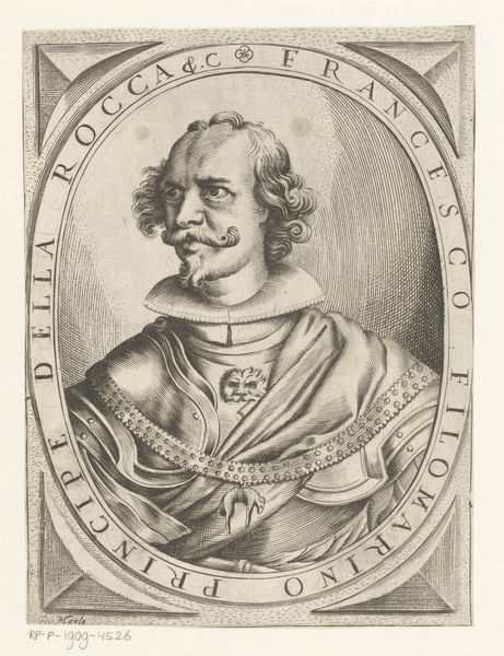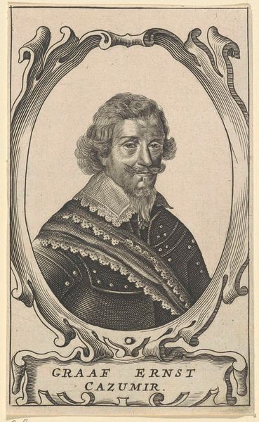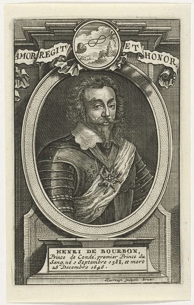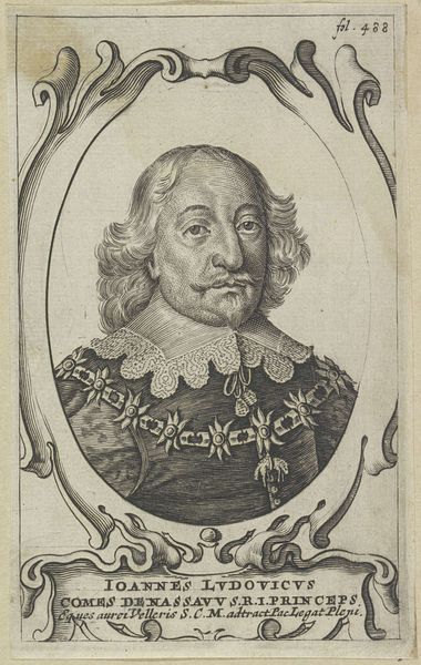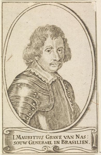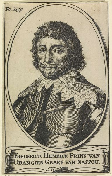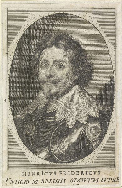 This is an anonymous portrait of Frederik Hendrik, Prince of Orange, rendered through delicate lines and structural precision. The composition immediately draws the eye to the figure encased within an oval frame, creating a sense of formal containment and classical balance. The intricate details of Frederik Hendrik's armor, achieved through fine lines, reveal the artist's attention to texture and form. The lines create a play of light and shadow, giving volume to the figure and a tactile quality to the metal. The artist carefully balances the realistic portrayal of the subject with the symbolic representation of power. By analyzing the formal qualities of this portrait, we see how the use of line and composition transcend mere representation, offering insight into the cultural values of the time. This piece demonstrates how art serves not just as a mirror of reality, but as a complex arrangement of visual elements that invite endless interpretation.