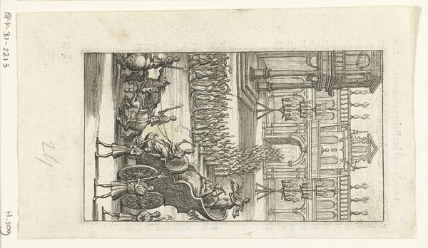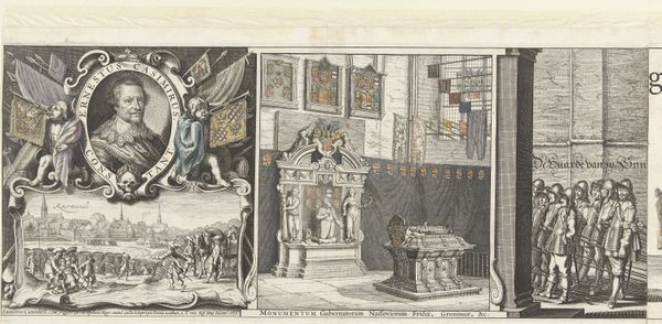 Curator: Materially speaking, this engraving, “Kist in een kerkinterieur” from 1592 by Frans Hogenberg, really puts labor on display. It reminds us that images, even then, weren’t just magically appearing – skilled hands and resources shaped them. Editor: This piece is fascinating; there's so much detail, considering the print medium. It has a very solemn mood, but also there’s a clear emphasis on civic display through those armorial banners. What strikes you most about it? Curator: What's significant to me are the means of production it suggests. The engraving process, the ink, the paper - these elements situate the image within a specific social context. How was the paper sourced? Who mixed the ink, and from what materials? What socio-economic class did the engraver come from? These were trade skills learned via apprenticeship, weren't they? This wasn't necessarily considered “high art.” Editor: I hadn’t thought of it that way. I guess I was too focused on the heraldry and the scene. Are you saying it blurs the lines between art and craft because its production involves a trade? Curator: Precisely! The very act of creating multiple prints suggests wider distribution, appealing perhaps to a broader, possibly less elite, consumer base. Look at the clothing of the figures in the engraving—what does it tell us about social status and the textile trade of the era? Even the choice of subject matter – a civic ceremony– aligns with a materialist perspective; Hogenberg’s print becomes a commodity within a larger network of exchange. What kind of consumption, and by whom, was he facilitating? Editor: So it's not just the image itself, but the entire production process and its place within the economy of the time. Curator: Exactly. By interrogating the materiality of the print, we gain insight into 16th-century labor, consumption, and the complex relationship between art, craft, and social status. Editor: I learned to not just look *at* the art, but also *through* it, understanding all its components, labor, and materials in historical context.