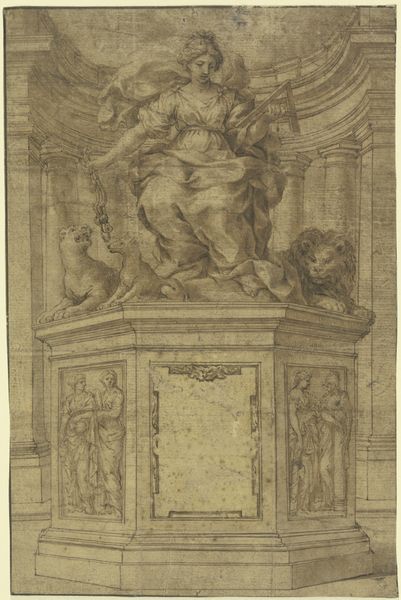 Curator: Here we have "Cartouche between two cherubs on pedestals," a drawing rendered in pencil, dating back to somewhere between 1695 and 1705, currently residing at the Metropolitan Museum of Art. It’s by an anonymous hand, but its elegance is undeniable. Editor: It’s oddly comforting. Like finding an old, forgotten Valentine. There's a sweetness to the cherubs, but also a formal, almost architectural rigidity to the cartouche itself. Curator: Absolutely, that juxtaposition is quite deliberate. The cherubs, acting as classical supports or caryatids, introduce that sense of lively animation, contrasting the otherwise severe stone framework. Think of it as the Baroque period's love of contrasts at play. Editor: The cartouche seems to want to hold something sacred, a secret whispered down through generations. Is there a deeper meaning here, maybe beyond mere decoration? Curator: Cartouches, throughout history, have often been associated with power and status. They framed royal names in ancient Egypt, for example. By the Baroque period, they'd become ornate frames, often for coats of arms, important names, or symbolic devices meant to convey virtue or status. So, the very structure speaks to commemoration. Editor: The vacant cartouche makes me think about potential – like a frame awaiting its masterpiece. There is a melancholy about what is missing, like a space waiting to be filled with memory. Curator: Indeed, and that void also invites our interpretation, doesn't it? To see our own narratives reflected within that classical structure. The anonymity of the artist too makes you ponder on what the art can convey versus what the artist wants. Editor: I like that. So the real masterpiece becomes the one we bring ourselves. Thanks. Curator: The pleasure's all mine. The conversation is never complete without fresh eyes.