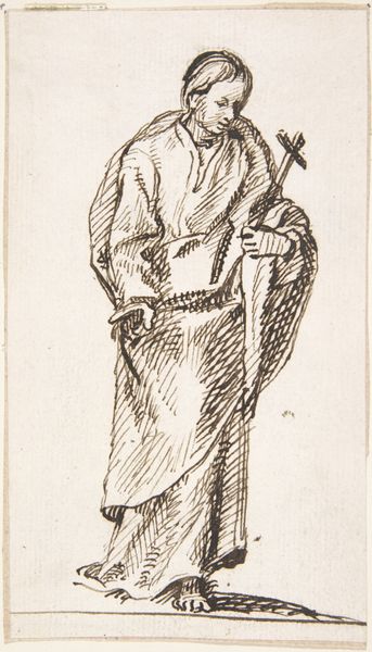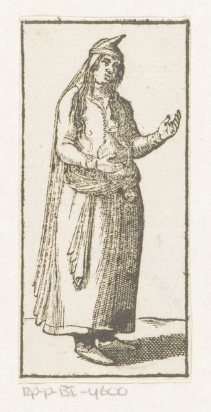 Editor: Here we have an etching from the 17th century titled "Standing Man with a Hat and a Moustache" by an anonymous artist. The fine lines of the engraving give the figure a surprising amount of dimension. What do you see in this work? Curator: Observe the composition itself. The figure is presented frontally, filling the pictorial space, and confined by the geometric boundary. This choice emphasizes the figure’s form. Do you notice how the artist utilized hatching to articulate the fall of light? Editor: I see it! It gives a sense of volume, especially on his robes, and the slight shadow around his feet grounds him. Is there significance to the placement of light and dark areas? Curator: Precisely. Notice also the artist’s economy of line; each stroke is deliberate, contributing to both contour and texture. Semiotically, the textures of his attire can convey meaning without having to rely on color or hue, especially given the limitations of the medium. Editor: I hadn't thought about the restrictions of the medium. The artist had to be really precise. The patterns created by the overlapping lines are mesmerizing. Are you drawn to specific aspects of this figure? Curator: The arrangement of folds, falling down the body—it guides the viewer's eye in a complex reading of planar shifts in a way only line work could produce, given it is rendered as pure surface, but our depth perception fills in where pigment is not afforded. Editor: Thinking about art in terms of surfaces and folds definitely adds another layer to the way I observe the artist's choices! Thanks for opening my eyes. Curator: You're most welcome. A keen observation of the artist’s formal choices reveals more than any historical account might convey.