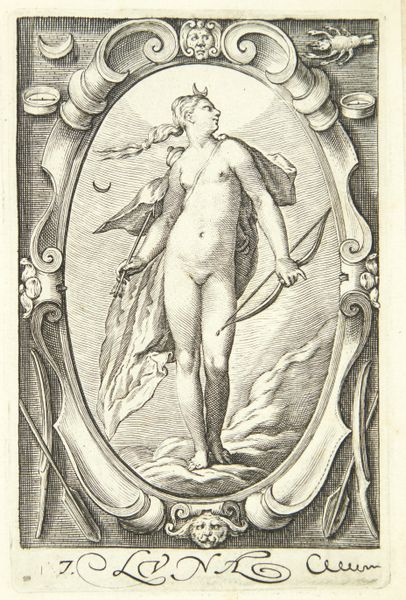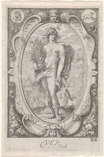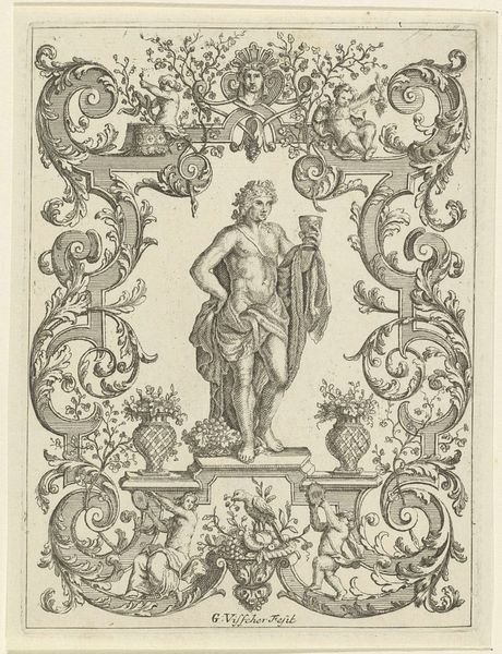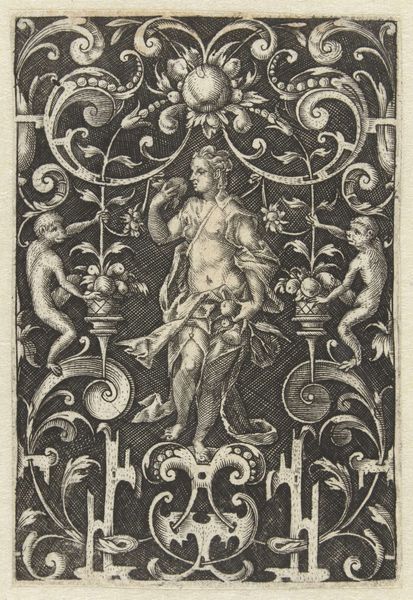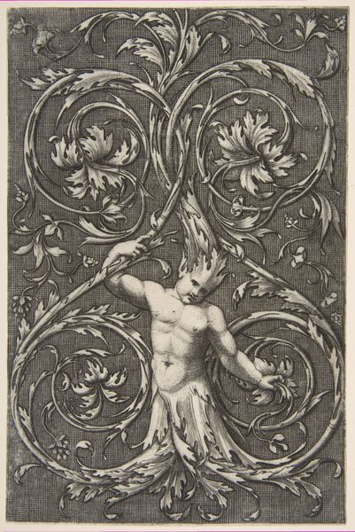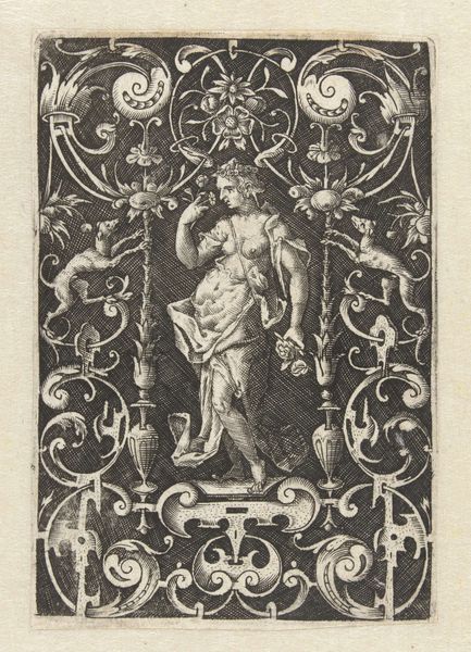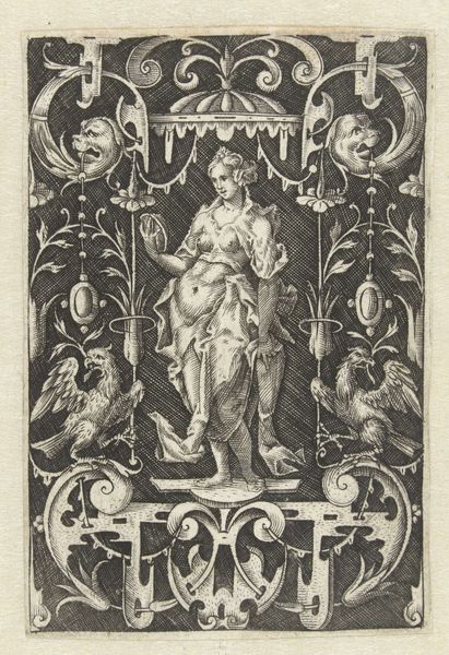 This print, titled "Vlakdecoratie met het Gevoel", presents a striking composition of linear precision. The anonymous artist employs a tight, intricate network of engraved lines to bring form to the shapes and objects which fill the composition. The artwork's structure relies on contrasting organic and geometric forms; a nude figure stands at the composition's center, framed by a swirling arch of foliage. Above, a bird perches, mirroring the serpent at the figure's feet. These visual elements are not merely decorative; they function as signs, evoking a range of symbolic meanings. The composition's symmetry is disrupted by the figure's pose, one hand extended, the other clutching cloth, destabilizing any simple interpretation. The artist seems to be challenging fixed meanings, inviting viewers to question established values, reflecting a broader cultural interest in the destabilization of established meanings. This piece functions not just aesthetically but as part of a larger cultural discourse, open to ongoing interpretation.