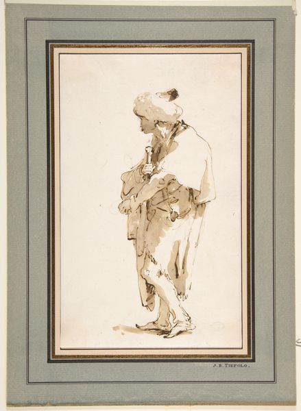 Curator: This ink drawing, rendered in nuanced shades of sepia, is titled "Bearded Man Looking Down to the Left," attributed to Giovanni Battista Tiepolo, circa 1757 to 1763. It currently resides here at the Metropolitan Museum of Art. Editor: There's such a beautiful sense of melancholy to it. He seems burdened, almost weary. I notice that the cloak, in such stark and flowing lines, contrasts quite sharply with the rather indistinct face hidden under the brim of his hat. Curator: It’s a wonderful study in Baroque sensibilities, despite its execution as a simple drawing. Tiepolo, deeply embedded within the Venetian cultural milieu, created this piece during a period marked by significant shifts in power and artistic patronage. Consider the social and economic forces that may have informed his depiction of this seemingly ordinary man. Editor: I see those Baroque gestures but, to me, it speaks beyond a specific era. The figure almost has an allegorical quality, he becomes the personification of something… perhaps humility, maybe resignation. His bowed head—a universal symbol of introspection or perhaps even defeat. What do you suppose Tiepolo wished to communicate through it? Curator: Hard to say definitively, but it speaks volumes about the market for portraiture and imagery at the time. Images were about disseminating ideas about how people should behave. Did he want people to avoid arrogance, and hubris? I imagine those messages still have power. Editor: Exactly! And then, look at how deliberately Tiepolo uses ink wash, almost like stage lighting, casting heavy shadows, heightening the man's isolation and somber mood. He is literally a figure consumed by shadow. Even today, viewers will respond to that heavy visual metaphor, because those visual cues stay relevant. Curator: Indeed, its resonance endures. These glimpses into the lives, both real and imagined, of ordinary people offer invaluable insight into the societal conditions from which art emerges and is ultimately judged. Editor: I think I now view more than just the shadow, but a hint of light reflecting in the image's continued symbolism over time. Thank you for expanding the context.