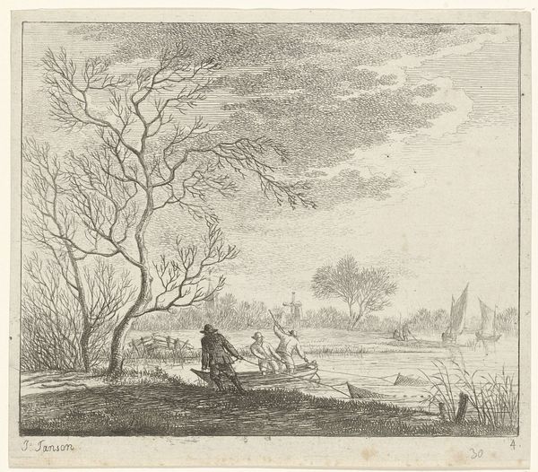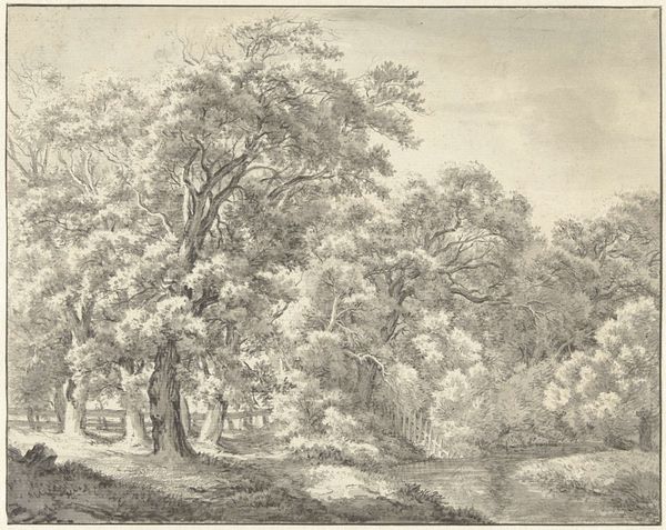 Franciscus Andreas Milatz created this landscape drawing using pen in gray ink, sometime between 1764 and 1808. At first glance, the scene is a symphony of tonal grays, where nature's textures dominate. Milatz masterfully employs line and shading to create depth and volume. Notice how the gnarled trunks of the trees command attention, juxtaposed against the softer, feathery foliage. The subtle variations in gray ink across the landscape serve to create a play of light and shadow, enhancing the three-dimensionality of the scene. This careful modulation invites us to consider how Milatz viewed nature. Is it a romantic ideal or a more structured, ordered vision? We can explore how the artwork destabilizes established meanings, values, or categories. Milatz's work offers a space for ongoing interpretation, where the formal qualities of the artwork intertwine with broader cultural and philosophical discourses.