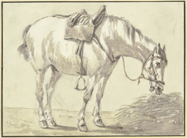 This is a drawing of two horses standing in a field, made by John Sell Cotman sometime in the early nineteenth century. Notice how the scene is composed with a serene openness. The subtle gradations of tone, achieved through delicate pencil work, evoke a soft, melancholic atmosphere. Cotman's technique here reflects an interest in the formal qualities of line and form, aligning with the aesthetic concerns of his time. Consider the way the artist uses line to define the contours of the horses. There’s a sense of realism but also simplification, reducing the animals to their essential forms. The landscape is rendered with an economy of detail that focuses attention on the spatial relationship between the figures and their environment. The drawing seems to destabilize the conventional pastoral scene. By focusing on old horses, Cotman reflects a broader cultural shift towards valuing simplicity, a perspective that challenges traditional hierarchies. The drawing invites us to contemplate the beauty in the everyday and the subtle power of understated forms.