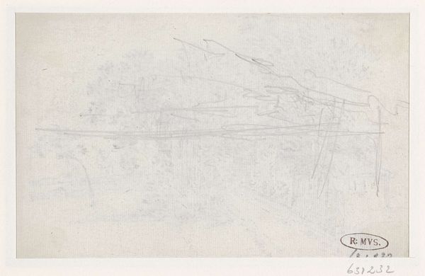 Curator: This work is titled "Abklatsch van de krijttekening op blad 4 verso," made with pencil on paper, sometime between 1875 and 1934, by Isaac Israels. It’s currently held in the Rijksmuseum. Editor: Ah, the Rijksmuseum! Seeing this piece... It feels like peering through a dusty window into a hazy memory. You know, the kind where details blur, but the essence remains. A bit melancholic, perhaps? Curator: I find that melancholic air really interesting in relation to Israels' wider oeuvre. His work frequently captured the fleeting nature of modern life. So this particular piece offers insight into artistic representations of time, ephemerality, and memory in the late 19th and early 20th centuries, which were of course periods of great upheaval. Editor: Right! There's a real sense of the unfinished about it. A study, maybe, rather than a definitive statement. Gives it this wonderfully intimate quality, like catching the artist mid-thought, just before the idea fully blooms. It feels really free. Curator: The "unfinished" aspect also emphasizes the artwork’s inherent process, inviting viewers to actively participate in the interpretive act. Also consider, though it's a preliminary work, how it still speaks to power dynamics of the time—Israels often depicted figures from different social classes. Editor: That's a very good point. Maybe what appears 'unfinished' to me is really a conscious choice to leave the narrative open-ended, to let viewers fill in those social gaps, or bring their own history to bear, you know? Makes it feel incredibly modern. Curator: Exactly, its ambiguity allows the audience to reflect on our relationship to both art and to history itself. Considering the history of the work as a sketch offers the public an intriguing perspective on the artist's creative process. Editor: Well said! I'm suddenly seeing it in a completely new light now... I guess that’s what art’s all about! Always keeps you guessing. Curator: Precisely. It is in that act of interrogation, as much as anything else, where value and understanding reside. Editor: Here's to always chasing that hazy memory! Thanks!