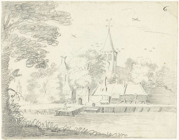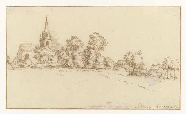 Editor: Here we have Jan Lievens' "View of a Village," housed right here at Harvard Art Museums. It's a delicate landscape sketch, feels almost dreamlike. What catches your eye when you look at it? Curator: It feels deeply personal, doesn’t it? Like a half-remembered place, seen through a veil. I’m drawn to how Lievens uses the reed pen to create such a sense of depth with so few lines. Notice how the church spire barely peeks through the trees. Is it a memory, a wish, or maybe just a quiet observation? Editor: A bit of all three, perhaps? It definitely invites contemplation, doesn't it? Curator: Absolutely. For me, it's a reminder that sometimes the simplest images hold the greatest mysteries. What about you? What will you remember after seeing this sketch?