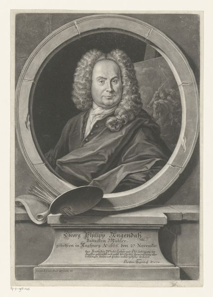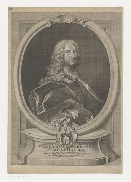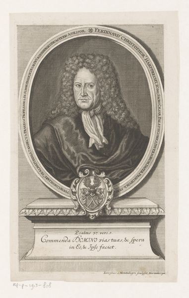 Editor: So, this is a portrait of Johann Jacob Baier by Christoph Weigel, created sometime between 1687 and 1725. It's an engraving held at the Rijksmuseum. The Baroque style gives it a sense of formality, but the sitter's expression…almost seems to hint at amusement. What strikes you about this piece? Curator: Ah, yes, Herr Baier, caught for posterity. You know, it’s interesting how engravings like this often served a dual purpose back then. They were portraits, sure, but also almost advertisements. They whisper of status and intellect, don't they? That intricate frame, the Latin inscription… It’s a calculated performance. Do you think Baier chose Weigel or vice versa, I wonder? Did they sip strong coffee together to strike this almost cheeky pose? Editor: I hadn’t thought of it as a performance! It's interesting how he is not exactly "handsome" and you get this quirky feeling. Why do you think the portrait is a little rough and not as sophisticated? Curator: Maybe because the goal of Weigel was less a pursuit of physical beauty than to transmit the essence of its nature and intellect. Or, perhaps, he simply sought the unvarnished truth. Weigel captures, doesn't he, something far more elusive than mere physical likeness. Isn't there almost a pre-Freudian wink? A depth there in the portrayal. Editor: That makes so much sense. Seeing it that way changes my entire perspective. It's not just a portrait, it's a curated image intended for legacy! Curator: Precisely! Weigel wasn't just documenting a face; he was immortalizing a mind. So, what will you remember most from your encounter, now that you've truly "seen" our man?