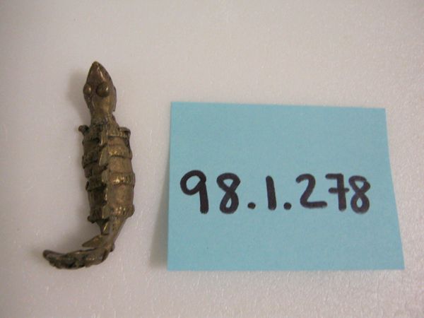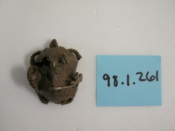 Curator: This is a goldweight from the Akan people, crafted sometime in the 19th or 20th century. It’s currently part of the collection at the Minneapolis Institute of Art. They used brass to create this sculpture. Editor: My first thought is it has this lovely weathered texture. Like it's held secrets and been through countless hands. A real talisman. What exactly is a goldweight? Curator: Precisely. These weren't just decorative. The Akan people, in what is now Ghana, used these small brass sculptures as weights to measure gold dust. Gold dust was the main currency there. The weight we see before us is in the shape of a calabash, also called a gourd, and was primarily an image reflecting independence, self-sufficiency, and sustainability, and that the individual carried a great responsability of keeping their people alive. Editor: The calabash seems more than functional. Is it symbolic as well as practical? There's this interesting twist, a very intriguing sculptural presence. Like it wants to reach out, twist our thoughts with symbolism, perhaps? It's compact, but so potent with meaning. Curator: Absolutely. While functional, Akan goldweights were also embedded with profound meaning, tapping into a rich tapestry of symbolism rooted in Akan culture, history, and proverbs. This could represent, say, prosperity. Gourds hold water. Without the gourds holding the water in harsh weathers, noone could have survived those tough moments. Editor: That's the sort of richness that these objects often hold isn’t it? What seems simple can become, can whisper cultural histories when we learn to look closely. The patinas of everyday objects become such profound palimpsests. It does lend it a very striking aesthetic presence. It almost makes you think what else it represents. Curator: You're right, it's precisely that blend of the everyday and the symbolic that gives objects like these so much resonance, something passed down, shared. Its small size contains a very wide landscape. It invites a certain reverence for the past, as well as self sufficiency. Editor: Right. It makes me reflect on how such compact creations held entire economic and philosophical universes within them.