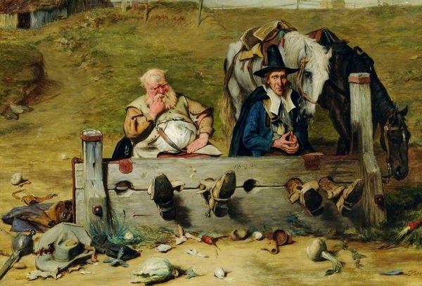 Editor: So, this is Cornelis Norbertus Gysbrechts' "Still-Life with Self-Portrait" from 1663, an oil painting. It’s such a curious composition! At first glance, it looks like a still life… but there’s this trompe-l'oeil effect that really throws me. How do you interpret this work? Curator: The deceptive realism, of course, is key. The artist is playing with the very nature of representation, creating a "fool the eye" effect. Look closely: what do you think of the items chosen and the way they're arranged? Consider how each element carries layers of significance. Editor: Well, there are the standard still life elements, grapes, fruit… artistic tools like a palette and brushes. The portrait, obviously, suggests the artist. But, it's the torn canvas effect that really makes it unique. Is he trying to say something about the nature of art itself? Curator: Precisely! The peeling back of the canvas—and notice how convincingly he renders that—can be seen as revealing something. In terms of semiotics, do you think the artist wants us to infer about a hidden layer? What does that symbol might refer to? Editor: Perhaps, something about the artist's self, but what he decides to show. What looks like a self-portrait is a mere construction? An artistic construction like everything in that room, if you think about it. The artifice of creating… and revealing oneself? Curator: Good observation. Remember this was created in the Dutch Golden Age, so this interplay of revealing and concealing touches upon ideas about prosperity, morality, and artistic skill that are characteristic of the period, too. The symbols he chooses carefully contribute to these discourses. What did you notice in particular? Editor: The fact that something is concealed that is in plain sight for example... Now, seeing this from a symbolic viewpoint sheds a new light. Curator: Exactly! The piece speaks volumes about not only the artist but also his relationship to society and art itself.