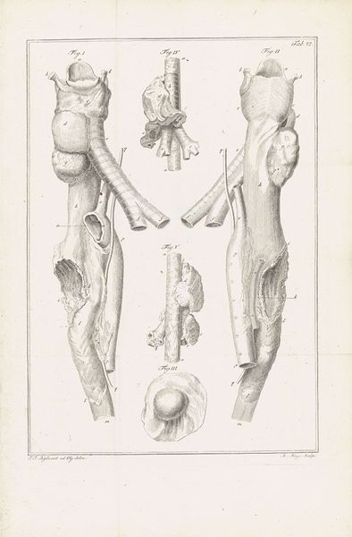 Editor: So, this is "Anatomische studie van de longen en het strottenhoofd" – Anatomical Study of the Lungs and Larynx – by Pieter van Gunst, an engraving from 1685. It’s… remarkably detailed, but also a bit unsettling to look at! What stands out to you? Curator: Beyond the immediate visual impact, consider what this print reveals about the cultural relationship with the body in the Baroque period. What power dynamics are at play when the human form is dissected and displayed so clinically? Editor: Power dynamics? It just seems like science, wanting to understand things. Curator: Precisely, but who gets to do the understanding, and whose bodies are available for study? Think about the social hierarchies of the time. Did these anatomical studies challenge or reinforce existing ideas about class, gender, and race? Who benefited from this knowledge? Editor: I never considered the "who benefits" aspect... So, medical advancements might come at a cost for some groups? Curator: Exactly. And, furthermore, how does this method of visual representation shape our perception of the body even today? Is the body just a collection of parts? Or something more? Think about it in relation to contemporary feminist and queer critiques of the medical industrial complex. Editor: It is pretty dehumanizing to see it so dissected. I guess, viewing it this way makes you realize medicine wasn’t always neutral. Curator: Right. What else did you notice about its composition, besides its scientific accuracy? Editor: Well, it's carefully arranged… and labelled, I guess to clarify. But seeing these once-living tissues organized so neatly is creepy. The image itself is clinical, but also strangely beautiful with its precise lines. It almost idealizes these human remains... or makes them into instruments for scientific advancement? Curator: Good observation. Beauty and clinical observation aren’t mutually exclusive but, instead, can be a mode of asserting dominance over the natural world. How can that perspective drive knowledge production? Editor: So this image is saying a lot more than just science. I think I’ll need more time with this. Curator: As do we all.