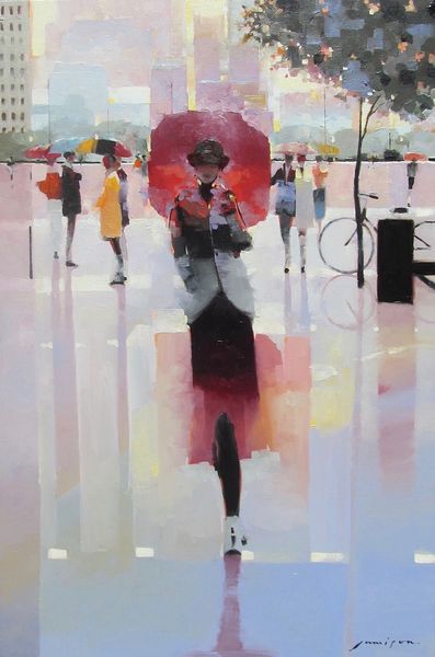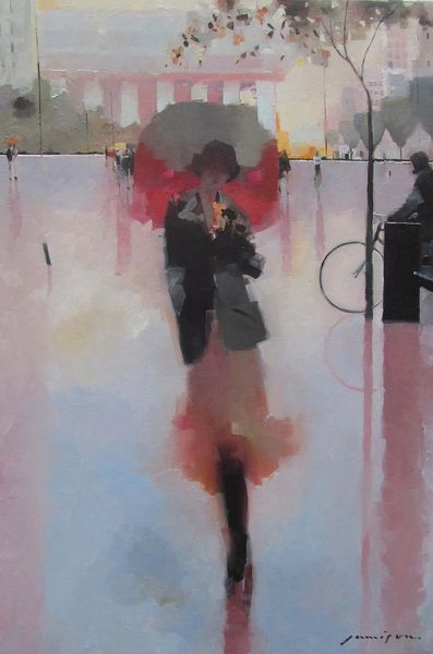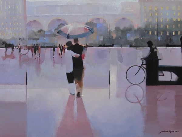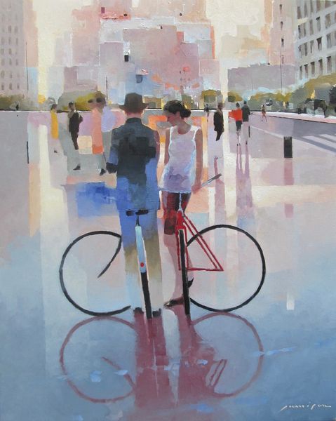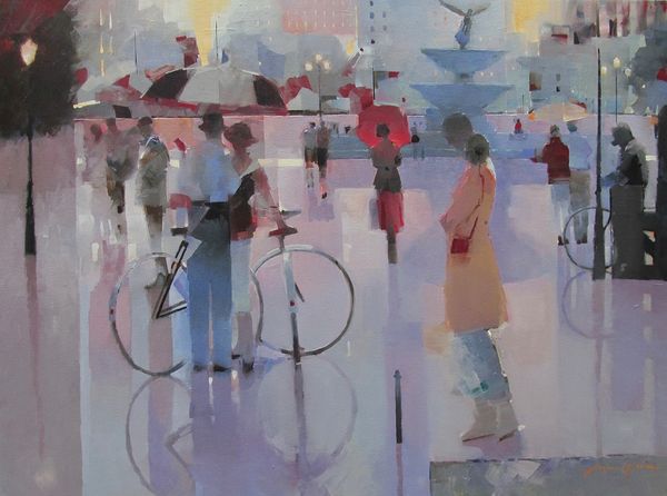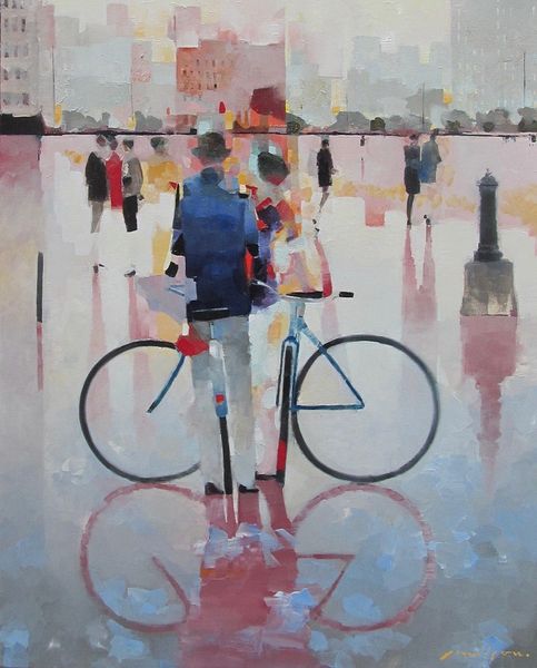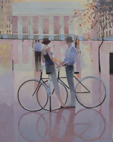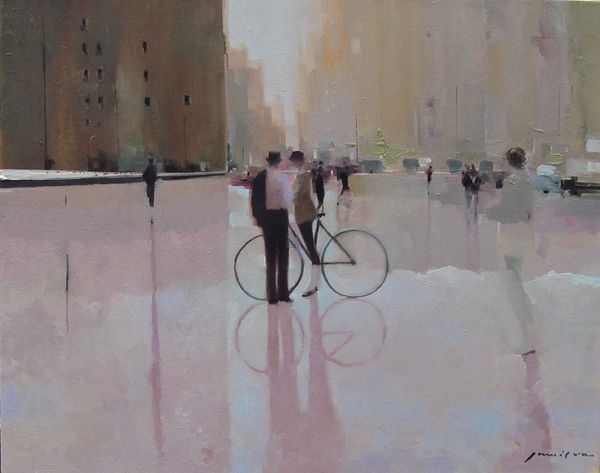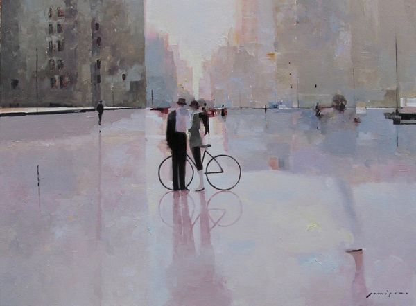Jeff Jamison created this painting, “Back to Basics,” with oil on canvas. In it, a woman and a bicycle stand out from the urban blur of a modern city street. The title asks us to consider what's being presented as basic. The bicycle has a nostalgic appeal to simpler times, as do the muted colors and impressionistic brushstrokes. It's tempting to see a critique of modern, fast-paced urban life, but it's worth noting that it does so from a privileged position. The woman is well-dressed, with a sophisticated but slightly old-fashioned style. Is this truly "back to basics," or just a romanticized longing for an imagined past? Looking at the artist's background, studying the revival of impressionistic techniques in contemporary art, and researching the cultural symbolism of bicycles could all help us to read the painting as an expression of social attitudes. Art is always made and received in a specific context, and art historians can help us understand that context.