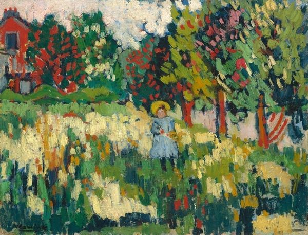 Editor: Here we have Georges Seurat’s "The Couple," created around 1884. It’s an oil painting that seems to depict figures in a garden or park. What strikes me most is how the figures almost dissolve into the landscape; they seem like fleeting apparitions. What do you see in this piece? Curator: I see echoes, palimpsests of pictorial language. The impressionistic technique—broken color, light fractured into dabs—becomes a symbolic code for impermanence and the elusive nature of modern life. These figures, are they walking, pausing, or are they fragments of memory being composed into a dream-like tableau? Note the recurrence of the parasol, like the woman's figure; they reappear throughout art history from antiquity through the modern era, serving as both a protective symbol and an emblem of leisure, a statement about cultural status, but also suggesting themes of both sheltering and concealing. Editor: So, the style itself carries a symbolic weight? The dabs of color, rather than just representing light, represent something more? Curator: Precisely. It’s a method mimicking perception, isn’t it? We don’t see the world as solid forms but as shifting sensations. And Seurat is very concerned with sensations and optical experiences; we feel a nostalgic atmosphere. That’s precisely what it means to represent modernity and modern leisure! Editor: It’s almost like the figures aren’t fully there, perhaps highlighting alienation despite being amidst leisure activities. Curator: Exactly! The separation of individuals within a social space is also visually communicated and embodied. Do you think these figures are together? Do you see a connection, even, represented on the canvas? The composition doesn't allow for us to establish direct connection, yet, together in the painting and their presence transforms its reading to *The Couple*. Editor: I guess I hadn't considered the figures’ detachment so overtly before, but thinking about the parasol and considering that visual cue has provided interesting nuance in its viewing. Curator: Indeed, thinking of such historical recurrence allows for the creation of the "modern" on something built to last. A true legacy.