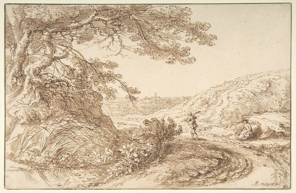 Editor: Here we have Johannes Janson's "Titelprent voor een serie met de twaalf maanden," created in 1783. It's an engraving, and what immediately strikes me is the stark contrast between the detailed foreground and the almost dreamlike quality of the distant landscape. What do you see in this piece? Curator: Well, framing this through the lens of history, consider how Janson's landscape participates in the broader 18th-century shift towards Romanticism and its fascination with nature. What role do you think images like these played in shaping Dutch identity or perceptions of their environment at that time? It presents an interesting window into how society valued and presented the natural world. Editor: That’s interesting. I hadn’t considered its impact on Dutch identity. It almost feels staged though, like a theatre backdrop. Do you think that’s a fair reading, considering its likely public function as part of a series? Curator: Absolutely! Think about how print series were distributed and consumed. They were accessible art, informing public taste and values. How does the artist use line and form to construct a sense of the ‘picturesque,’ catering to contemporary tastes and desires for an idealized nature? It suggests a public engagement with images, filtered through artistry and commerce. Editor: So, the ‘natural’ world isn’t just depicted, but manufactured, in a way, through the conventions of engraving and the art market? Curator: Precisely. This challenges notions of art as a purely individual expression. It also compels us to think about art as a social product, deeply intertwined with institutions, markets, and cultural ideologies of the era. It really changes how we think of the ‘authenticity’ of a landscape. Editor: Wow, that's a really helpful way to consider it. I definitely have a different perspective on it now, less about the beauty of nature and more about how that beauty was packaged and sold to the public.