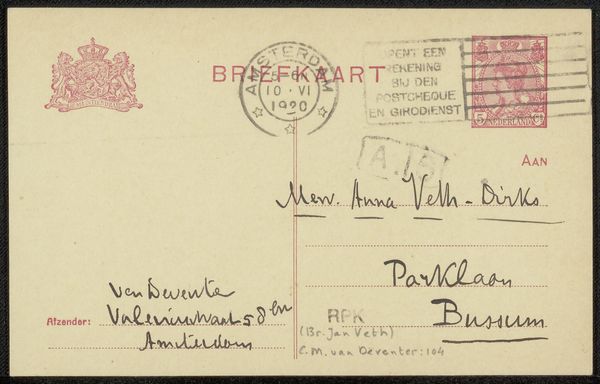 This is a postcard to Jan Veth, made with ink and stamps, likely around the turn of the last century, by Chap van Deventer. It's like a little abstract painting, but with real world intentions. I can see the artist was probably less concerned with perfection, and more with the act of communication, writing and sending this message through the mail. The stamps are like miniature artworks themselves, with their graphic depictions of value, and the overall palette is muted: beige, brown, and red, all softened by time. Those cancellations smeared across the stamps and the printed coat of arms are such beautiful details. They remind us that art isn't just about something precious in a frame. Look at the confident, almost playful handwriting too. The way 'Bussum' is written is so carefree and sure. It’s a reminder that even the simplest, most functional things, like a quick note, can have an unexpected aesthetic quality, like a Cy Twombly scrawl. It's the everyday made extraordinary. The conversation never ends!