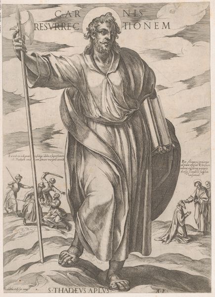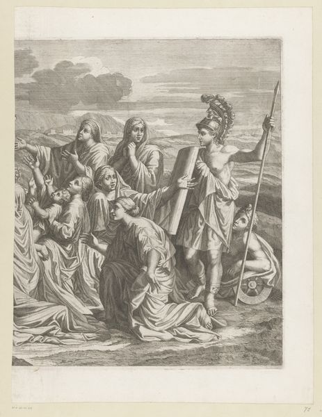 This image of Noah Building the Ark is from "Dalziels' Bible Gallery", made by George Frederic Watts. It’s a wood engraving, a technique that uses a block of wood, meticulously carved to create an image. Look closely, and you’ll notice the incredible detail achieved through this process, from the texture of Noah’s beard to the rough-hewn planks of the ark. Wood engraving was a skilled craft, demanding precision and patience. The process involved the engraver using specialized tools to cut away areas of the woodblock, leaving the design raised. This was then inked and printed, creating multiple reproductions. Notice the figures around Noah, some laboring, others offering assistance, alluding to the communal effort required for such an immense undertaking. The image then, speaks to the social dynamics of labor, and perhaps even hints at the hierarchies inherent in collaborative work. The very act of creating this print – the labor of the artist, the skill of the engraver, the use of a reproducible medium – adds layers of meaning to the artwork. It reminds us that art is not just about the final image, but also about the processes, materials, and the people involved in its creation.