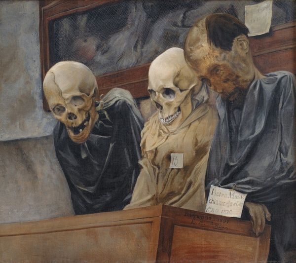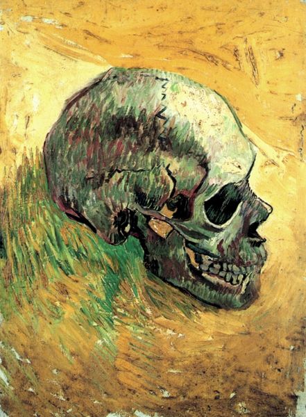 Editor: This is Paul Cézanne’s "Pyramid of Skulls," painted around 1900. It's an oil painting, and there's something incredibly unsettling yet compelling about the composition. I am particularly struck by the use of light. What’s your take on this piece? Curator: Unsettling, yes, but wonderfully so. Cézanne isn't just painting skulls; he is meditating on mortality, almost playing with it. I find the impasto, that thick application of paint, brings them to life in a strange way. It's not just still life; it’s "still life" with a wink. Editor: A wink? I hadn’t thought of it that way. It seems more solemn. Curator: Perhaps. But I like to imagine Cézanne with a glint in his eye, considering our inevitable end with a degree of acceptance. This piece links into a long artistic tradition of ‘Vanitas’ paintings - artworks designed to remind the viewer of the transience of life, the futility of pleasure, and the certainty of death. What do you make of the perspective? It’s not exactly academic, is it? Editor: It's skewed, isn’t it? Almost like he's inviting us to arrange the skulls ourselves. Curator: Exactly! It feels incredibly intimate, as though we’ve stumbled upon Cézanne's private contemplation. Do you get the sense of how radical it was for its time? Most were painting pretty portraits and landscapes. Cézanne…stacks skulls. Editor: I see what you mean! It’s provocative, even now. I initially found it morbid, but now it does have a certain playful energy. Curator: Indeed! A reminder that even in darkness, there's a flicker of something, perhaps humor, perhaps hope. The Post-Impressionists sought that something; here, it flickers between the teeth of skulls. Editor: This has completely shifted my perspective! I'll never look at a skull the same way again. Curator: Wonderful! Isn’t it incredible how art can rattle our bones and tickle our funny bone at the same time?