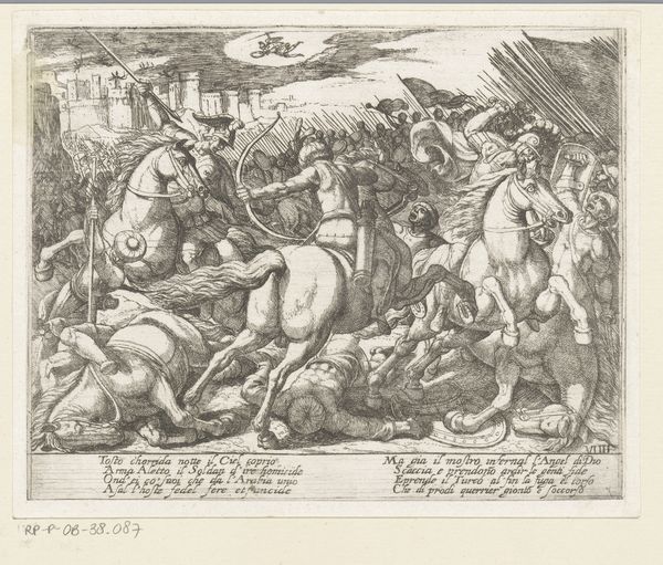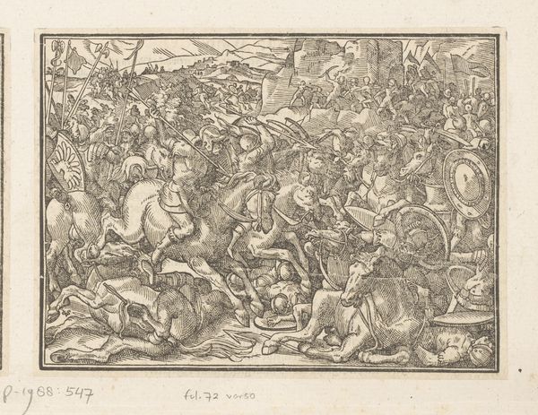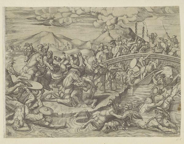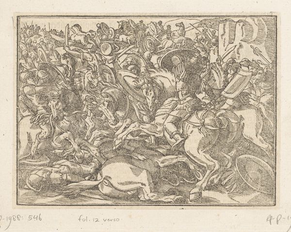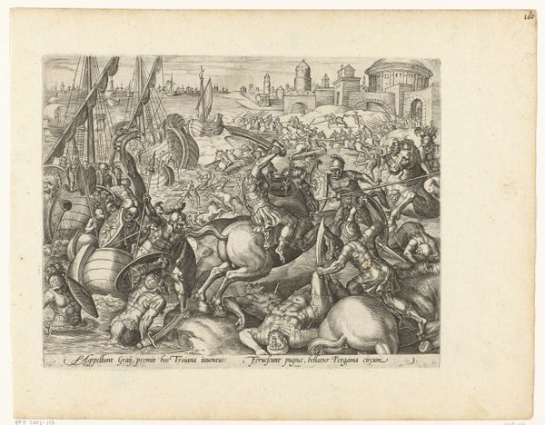 Curator: Editor: Welcome to the Met. We're looking at Jean Mignon's "Battle Before Troy," an engraving from the mid-16th century. The scene is so dense; bodies and horses crammed together. What can you tell me about this print? Curator: Let’s consider this engraving in the context of 16th-century printmaking. The availability of prints allowed for wider dissemination of stories, styles, and yes, even propaganda. Notice the process of meticulous, repetitive mark-making, the intense labor invested in creating these images, and what would become of them? Editor: Do you mean its mass production? Curator: Exactly! Printmaking enabled the commodification of imagery like "The Battle Before Troy." Suddenly, owning a battle scene, filled with "classical" figures, wasn’t just for the elite. How do you think the change in materials affected subject matter? Editor: It let the artist communicate battle themes to the wider audience, that the elite previously only could enjoy? Curator: Precisely. And that brings us to how engravings democratized art and allowed for shared social meaning. Now think about Mignon, painstakingly incising these lines, participating in a burgeoning market for imagery… a skilled labor! The artistic innovation is within Mignon's practice, technique and social context of his art. What do you make of that now? Editor: Now, thinking about all the labour and technicalities that had to go into this production, and its effect in disseminating imagery… I didn’t appreciate how innovative an artwork like this was. Thanks for sharing!