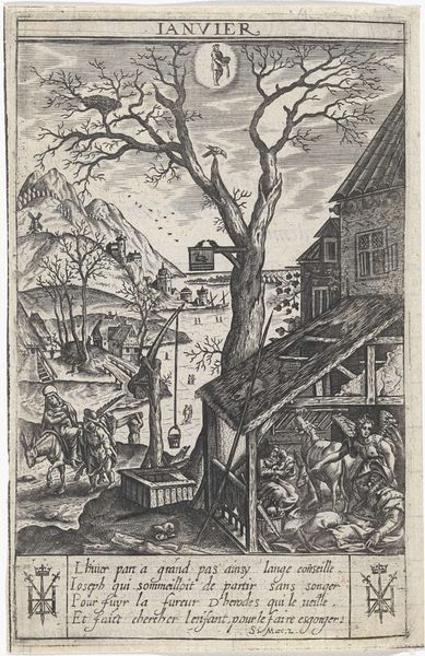 Jan Gerritsz Swelinck made this print, December, using etching, a process where lines are incised into a metal plate to hold ink. Notice how the starkness of the etched lines shapes our understanding of this scene. The material qualities of the printmaking process give the image a stark contrast between light and shadow, emphasizing the cold, inhospitable atmosphere of December. The sharp lines create a sense of texture in the buildings, clothing, and even the bare tree, adding depth and realism to the scene. The detailed rendering of the figures, particularly Joseph and Mary, highlights the human element within this social context. Swelinck skillfully uses etching to imbue the artwork with cultural significance, using printmaking, traditionally associated with mass production, to bring a recognizable scene from the bible to a wider, potentially less wealthy, audience. This challenges the traditional distinctions between fine art and craft, emphasizing the importance of materials, making, and context in understanding the full meaning of an artwork.