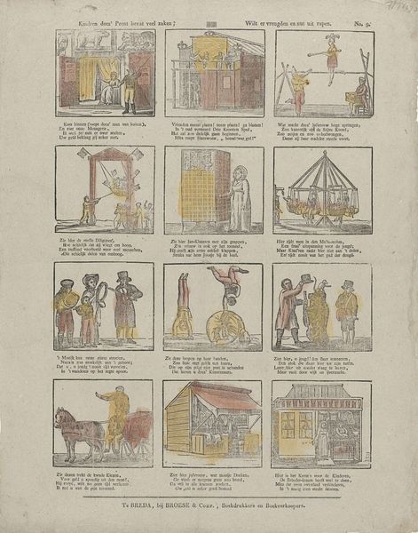 This hand-colored etching of children playing, by Alexander Cranendoncq, was made in the Netherlands. Its format is that of a matrix, presenting twelve small scenes arranged in a grid. The use of line is dominant in the composition, defining each figure and structuring the spatial arrangements within each frame. Washes of muted color soften the linearity and add depth, differentiating each vignette. The structure invites us to consider the juxtaposition of diverse activities. Note how the lines and color connect scenes thematically, creating visual rhymes that suggest underlying patterns of childhood behavior. Each vignette serves as a sign, a semiotic marker of social interaction. Consider how the artist uses this structured format to explore the relationship between individual and collective experience. Are the children confined or liberated by these social structures? Cranendoncq prompts us to consider the dual nature of play as both a form of expression and social conditioning.