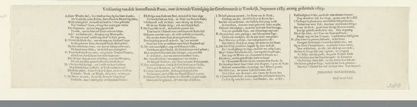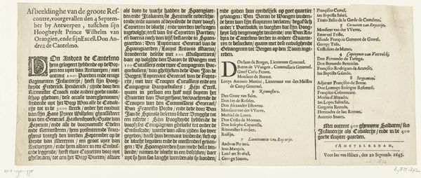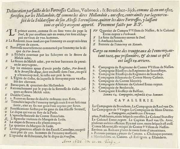 This etching, made by Joannes Meyssens around 1638, presents a textual account of the failed attack on Fort Kallo, using words to map out a military encounter. Produced in the Dutch Republic during the Eighty Years' War, this print reflects the intense political and military tensions of the time. Its all-text format reveals a culture deeply engaged with the power of the written word to shape public opinion and document historical events. The detailed descriptions of troop movements and fortifications suggest an audience familiar with military strategy and eager to follow the conflict's progress. The print also speaks to the institutional role of art in disseminating information and propaganda during wartime. By carefully documenting the battle, Meyssens' work served to inform and perhaps even to bolster morale. Historians can delve into archives, military records, and period newspapers to understand the print’s context and impact better. In this way, the artwork highlights the social conditions that shape artistic production, demonstrating how art can be contingent on specific historical and institutional factors.