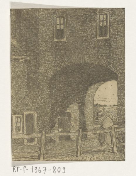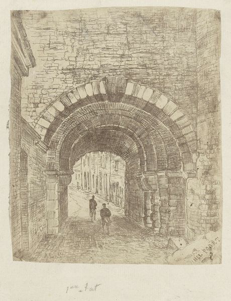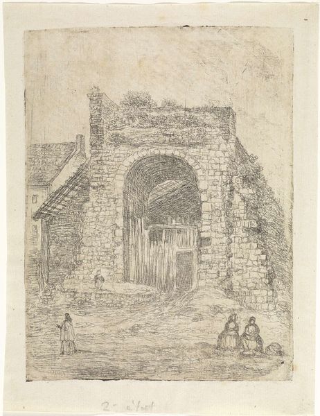 Alexander Schaepkens created this etching, “Helpoort te Maastricht”, using ink on paper. The Helpoort, or Hell’s Gate, was constructed in Maastricht, Netherlands in the 13th century. It is the oldest city gate in the country. In the middle ages, city gates acted as ports of entry for commerce and points of contact for outsiders, and also served as fortifications and defensive structures. Schaepkens’s atmospheric rendering of the gate shows the influence of Dutch Romanticism. The image presents the gate not only as a historical artifact, but as a space in which daily life unfolds. We see people traversing the opening, going about their day. To understand Schaepkens's image more fully, we might consult historical records and city plans to learn more about the gate's changing function over time and the cultural significance of Maastricht. Only then can we appreciate the complex social dimensions of this seemingly simple work.