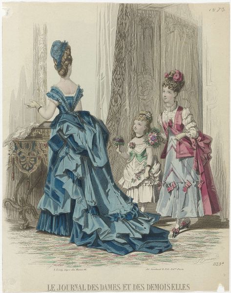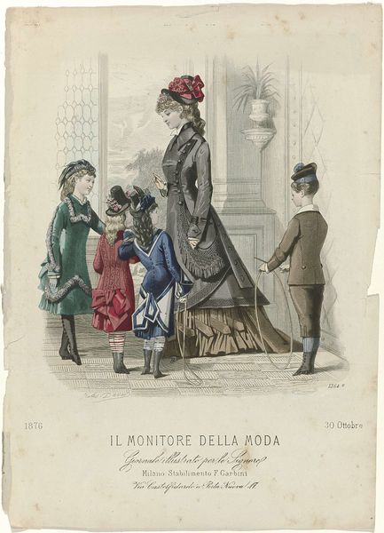 Jules David created this watercolor, "Family Group," during the 19th century. The painting is dominated by the towering figure of a woman in a dark, elaborate dress, flanked by her smaller, brightly clothed children. The contrast in scale and color creates a visual hierarchy, emphasizing the mother's central role. David’s application of watercolor brings a certain softness, yet the sharp lines defining the clothing's intricate details also show the fashion of the period. The structure of the image is carefully arranged to convey certain cultural meanings. The mother’s height and central position suggest authority, a convention that reflects societal norms of the time. The children, each individualized in their attire, form a semiotic ensemble of youth and vitality, contrasting with the mother's mature and imposing presence. This contrast subtly destabilizes the concept of family as a homogenous unit, instead highlighting distinct roles and identities within the group. David's work, while seemingly a simple family portrait, invites ongoing interpretations about social structure, representation, and the dynamics of family identity.