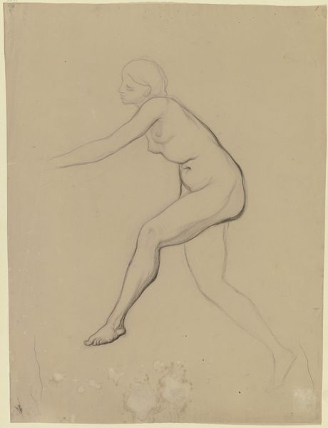 Editor: Here we have Victor Müller’s drawing, "Female Nude, Kneeling to the Left, Seen Half from the Back, the Left Arm Extended Backwards". It's undated, created with chalk and pencil on paper. The figure feels caught between worlds, suspended in motion. How should we interpret the gaze of this woman, looking back, almost defiant? Curator: Precisely! It's essential to acknowledge how the portrayal of the female nude intersects with power dynamics. While seemingly traditional, what could it mean to see a woman kneeling but gazing away, seemingly escaping the male gaze rather than offering herself to it? Who is she looking towards? Whose perspective are we invited to take? Perhaps Müller’s study subtly critiques the objectification inherent in academic figure drawing. Editor: That’s fascinating. I hadn't considered it as a form of resistance, however small. Is the incompleteness part of this statement, suggesting a study that never fully intends to "finish" or comply with expectations? Curator: Indeed. Think about the constraints placed upon women, both as artists and models, within the 19th-century art world. The "unfinished" quality could symbolize the limitations placed upon their self-expression, their autonomy. How might this relate to contemporary discussions around body image and representation? Editor: So, we’re not just looking at a study of form, but potentially at a statement about female agency, even within a very traditional subject. Curator: Exactly! It urges us to challenge conventional readings and consider whose voices and perspectives have been historically marginalized in art. The gaze of the artist, model, and viewer can and should be questioned. Editor: I’ll definitely think about the historical context of the artist, and the figure, from now on.